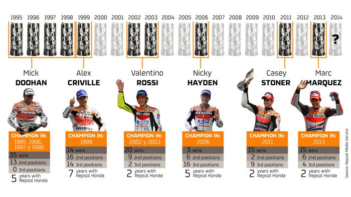 Με τη Repsol Honda έτρεξαν και τρέχουν αναβάτες-θρύλοι όπως οι Mick Doohan, Alex Criville, Valentino Rossi , Nicky Hayden, Casey Stoner και φυσικά Marc Marquez.