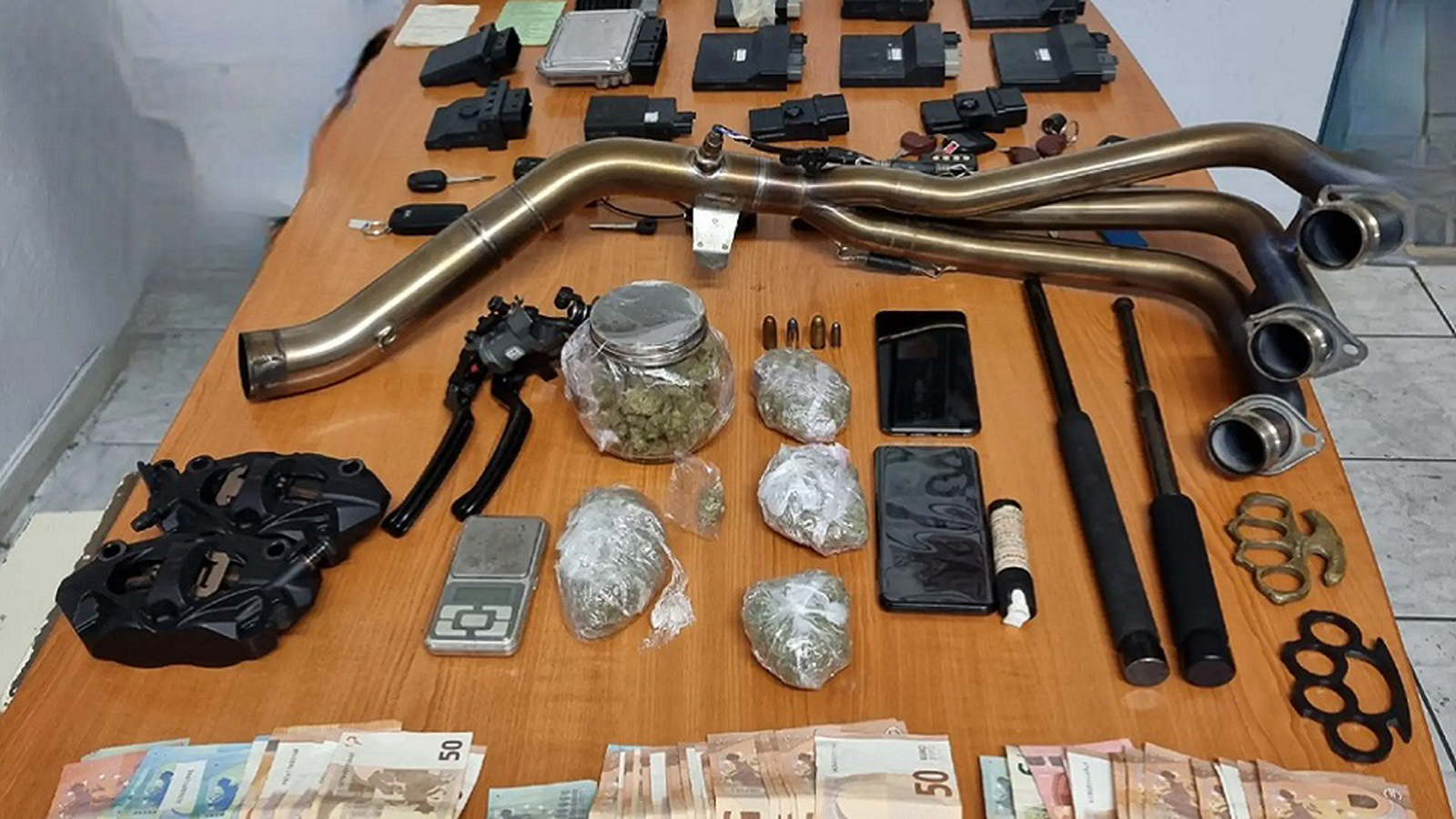 Σε αποθηκευτικό χώρο που χρησιμοποιούσε βρέθηκαν και κατασχέθηκαν φανάρια, καντράν, πλαστικά καλύμματα και προστατευτικά μέρη, κάθισμα, ντεπόζιτα βενζίνης, σχάρες, εξατμίσεις, ρόδες, αμορτισέρ, εξαρτήματα φρένων, καλώδια, φίλτρα καρμπιρατέρ, μοτοποδήλατο με απόξεση στον αριθμό πλαισίου και κινητήρα, σκελετός μοτοσικλέτας με απόξεση στον αριθμό πλαισίου, κ.α.