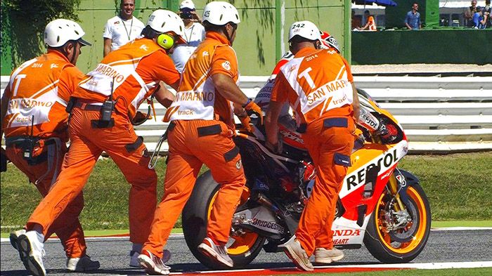 Μετά την πτώση του ο Marquez δέχθηκε τη βοήθεια των κριτών για να βάλει ξανά μπροστά τη μοτοσικλέτα του, είχε μείνει όμως πολύ πίσω.