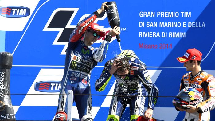 Πόσο πολύ το χάρηκε αυτό το ντους με σαμπάνια ο Vale; Χαρούμενος και ο Jorge, που βρέθηκε δεύτερος, χαρίζοντας το 1-2 στη Yamaha, με τρίτο τον Pedrosa.