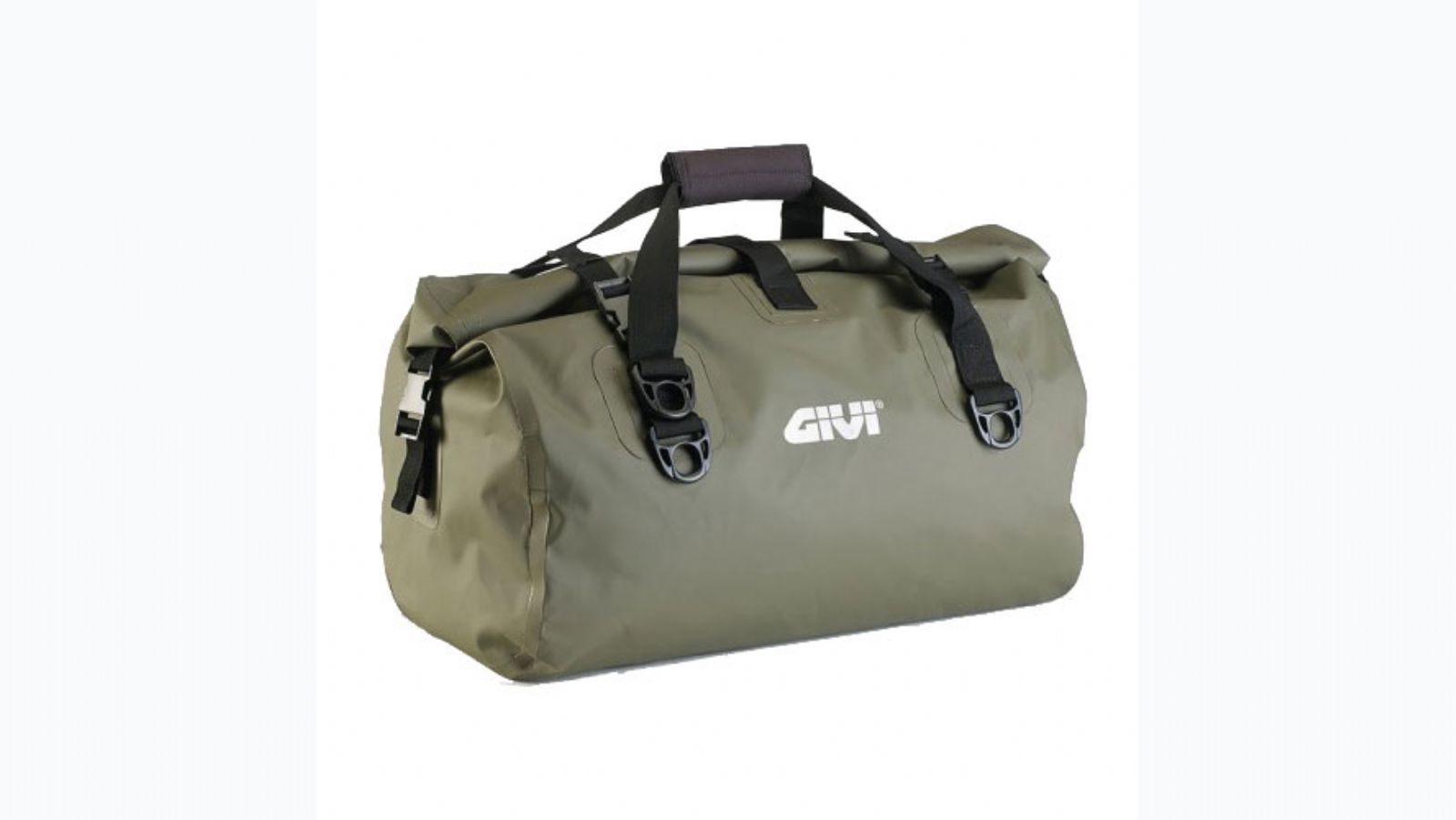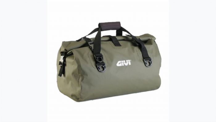 Αδιάβροχος κυλινδρικός σάκος ουράς σε χακί χρώµα, Η χωρητικότητα του είναι 40 λίτρα.