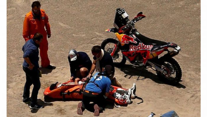 Ο 28χρονος νικητής του περσινού αγώνα, ήταν από τα φαβορί φέτος, αλλά σύμφωνα με πληροφορίες, έπεσε σε μια μεγάλη τρύπα μεταξύ τρίτου και τέταρτου σημείου ελέγχου και τραυματίστηκε στην πλάτη. Συνέχισε να οδηγεί για 5 χιλιόμετρα ακόμα, αλλά ο πόνος και η έλλειψη αίσθησης από τα πόδια του, ανάγκασαν τον αναβάτη της KTM να εγκαταλείψει τον αγώνα. Μεταφέρθηκε αεροπορικώς στην κλινική Anglo Americana στη Λίμα του Περού όπου υποβλήθηκε σε εξετάσεις. Οι ακτινογραφίες ευτυχώς δεν έδειξαν κάποιο κάταγμα.