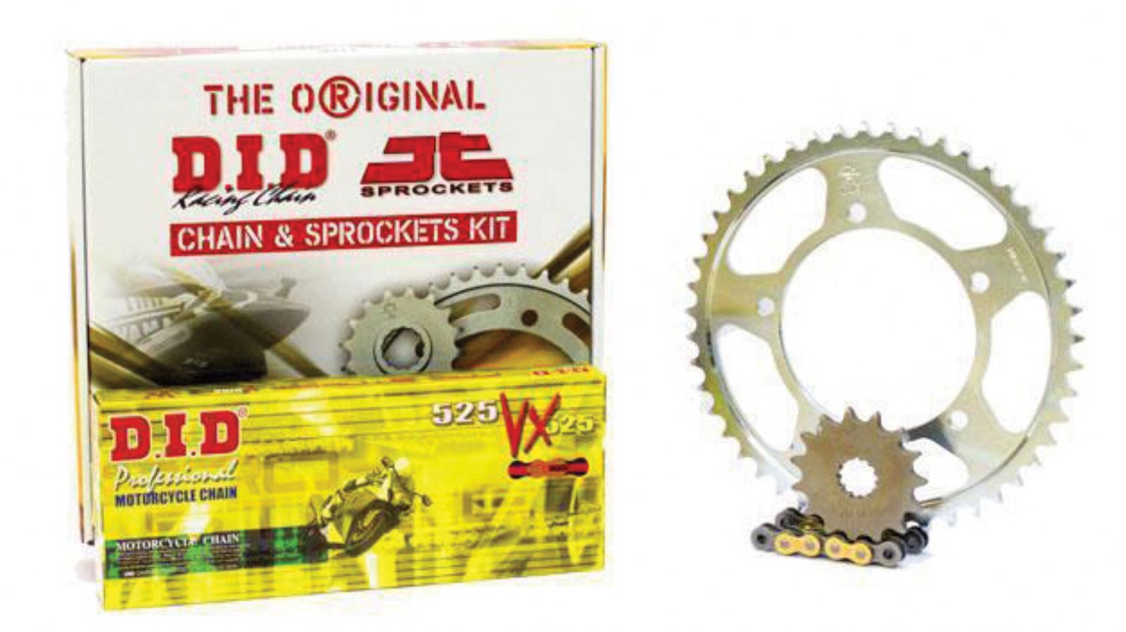 Το σετ κίνησης έρχεται µε την αλυσίδα D.I.D 525 VX G&B XRing, που είναι ειδικά κατασκευασµένη για µοτοσικλέτες επιδόσεων και προσφέρει αυξηµένη αντοχή, µεγαλύτερη διάρκεια ζωής, ποιότητα κατασκευής και την καλύτερη σχέση τιµής και απόδοσης.
