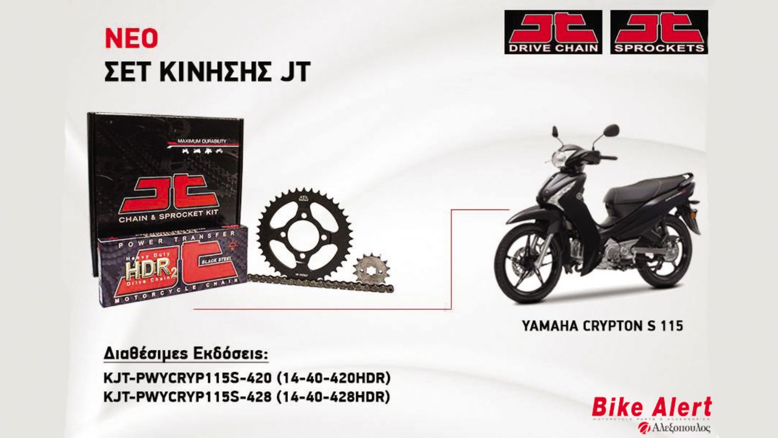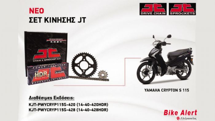 Aμεσα διαθέσιμο set κίνησης (γρανάζια JT σε συνδυασμό με 420 ή 428 ενισχυμένη HDR μαύρη αλυσίδα JT) για το bestseller «παπί» της YAMAHA, Crypton S 115.