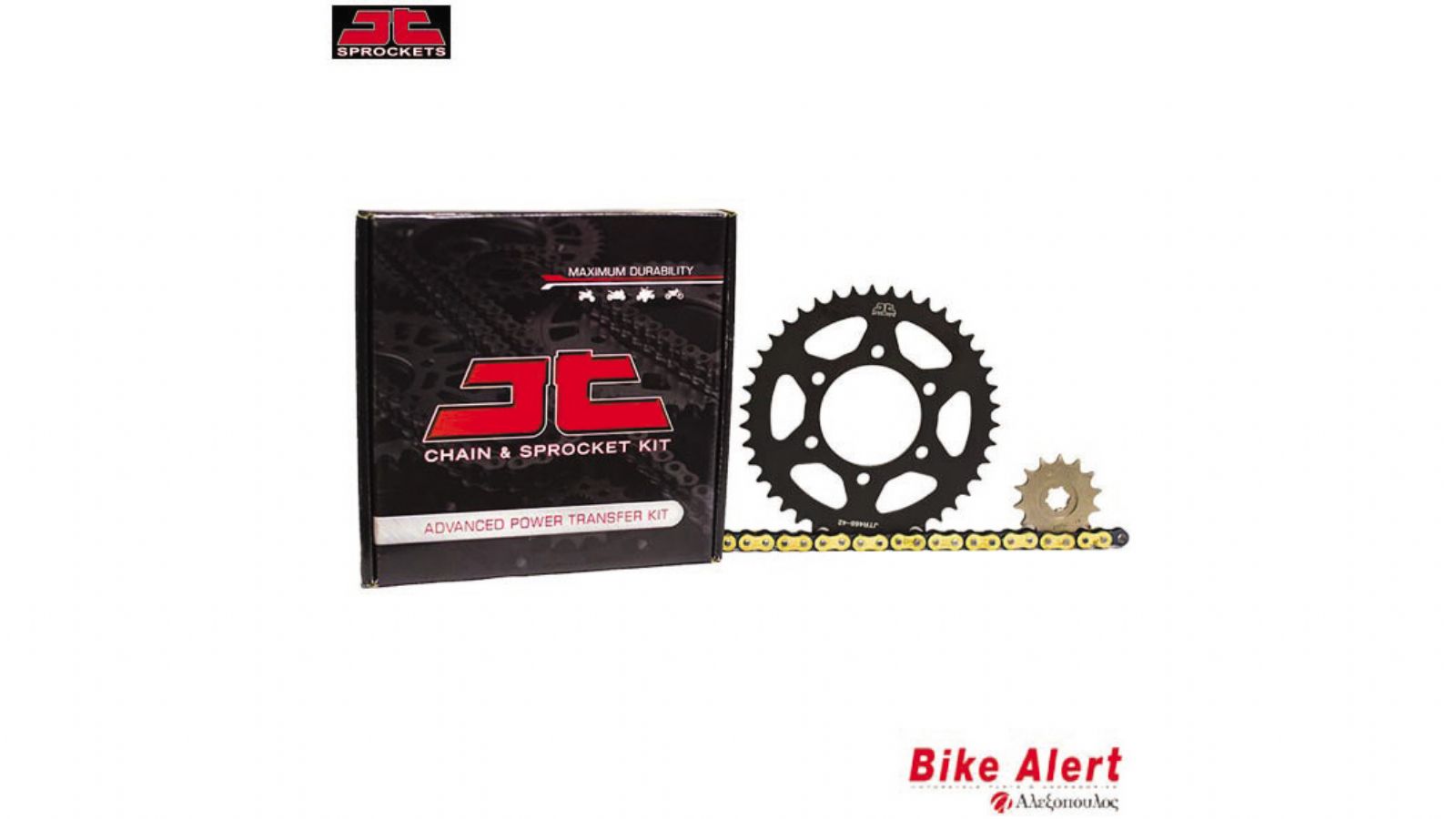 Περιλαμβάνει γρανάζια κατασκευασμένα από Ιαπωνικό ατσάλι HighCarbon C49, ανώτερο σε ποιότητα από πολλών "μεγάλων" μοτοσυκλετών και για πρώτη φορά έξτρα ενισχυμένη χρυσή O`Ring αλυσίδα. Ο συνδυασμός τους αποτελεί εγγύηση για πολλά απροβλημάτιστα χιλιόμετρα. Σύγχρονη και αναβαθμισμένη εμφάνιση με την εγγύηση της καλύτερης ποιότητας γραναζιών και αλυσίδας JT. Αμεσα διαθέσιμο για όλα τα παπιά της αγοράς.