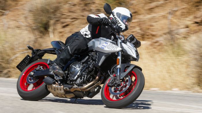 Εάν λοιπόν μπορείς να συμβιβαστείς με τον κλασικό "εχθρό" των γυμνών στην εθνική που δεν είναι άλλος από τον αέρα, θα μπορέσεις να ταξιδέψεις άνετα και στον αυτοκινητόδρομο, ενώ το αναπόσπαστο κομμάτι των καθημερινών μετακινήσεων, γίνεται από καθαρά διαδικαστικό, διασκεδαστικό. Οι αλλαγές που έχει δεχθεί το μοντέλο για να πληρούνται τα Euro5+ πρότυπα είναι εμφανή από την στιγμή που θα πατήσεις την μίζα, καθώς παρά την εξαιρετική χροιά του κινητήρα, ο ήχος που καταφέρνει να βγει από την εξάτμιση είναι "φιμωμένος" και αρκετά χαμηλής έντασης. Το Traction Control είναι ένα ακόμη στοιχείο το οποίο θα έπρεπε να αποτελεί παράδειγμα προς μίμηση για άλλες εταιρείες, καθώς είναι ένα από τα πιο καλορυθμισμένα που θα βρεις σε γυμνή μεσαία μοτοσυκλέτα (και όχι μόνο) στην αγορά. Δεν επεμβαίνει απότομα, περιορίζοντας την ολίσθηση αποτελεσματικά και «αθόρυβα», χωρίς να το καταλαβαίνεις πολλές φορές. Στην θέση 1 μάλιστα επιτρέπει ένα μικρό ποσοστό ολίσθησης σε ασφαλή επίπεδα, προσφέροντας απόλυτα ομαλή επιτάχυνση. Λειτουργεί και σαν περιοριστής σούζας, ενώ φυσικά μπορεί να απενεργοποιηθεί. &&&&Οι αναρτήσεις έχουν σχετικά σφικτή ρύθμιση και σε συνδυασμό με το αφρώδες της σέλας, σίγουρα θα νιώσεις τις πιο έντονες κακοτεχνίες της ασφάλτου, αναδεικνύοντας το σπορ DNA που έδωσε η Suzuki στο GSX-8S. Οδηγώντας όμως σε στριφτερές διαδρομές θα λάβεις την ανταμοιβή σου, με το μπροστινό να δίνει περίσσεια πληροφόρηση στον αναβάτη, χωρίς να εμφανίζει μεγάλη βύθιση όταν πέφτεις στα φρένα και το αμορτισέρ να προσφέρει σταθερότητα σε δυνατές επιταχύνσεις στην έξοδο των στροφών. Οι δυνατότητες τις μοτοσυκλέτας ξεπερνούν κατά πολύ αυτές του μέσου αναβάτη, επιτρέποντάς του να τις εξελίξει πάνω στην σέλα της, ενώ είναι σταθερή σε μεγάλες κλίσεις και υψηλές ταχύτητες. Το λιθαράκι του σε αυτό έχει βάλει το μεταξόνιο των 1,465χλστ, το οποίο έχει φέρει την κατάλληλη ισορροπία μεταξύ ευελιξίας και σταθερότητας. Τέλος η αίσθηση που δίνουν τα φρένα είναι πολύ καλή, με το αρχικό δάγκωμα να είναι ισχυρό χωρίς να τρομάζει και την ακινητοποίηση της μοτοσυκλέτας από τα 100χλμ/ω να έρχεται σε 44 μέτρα σύμφωνα με τις μετρήσεις μας.