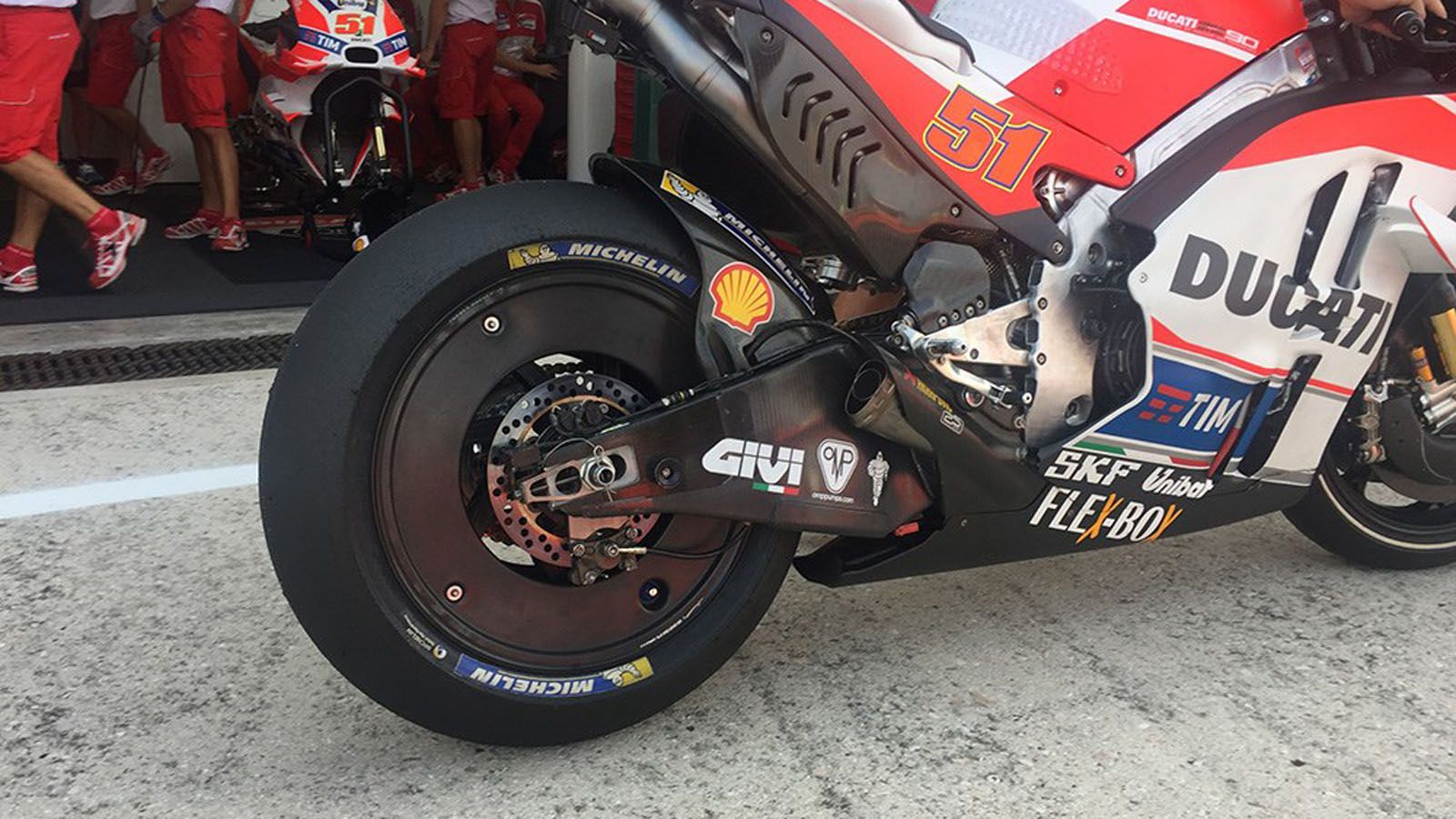 Μια φωτογραφία που κυκλοφόρησε μετά τις τελευταίες δοκιμές της Ducati, που πραγματοποιήθηκαν μετά τον αγώνα του Misano, δείχνει την Desmosedici GP16 να φέρει ένα κάλυμμα στον πίσω τροχό. Ο δοκιμαστής της Ducati, Michele Pirro, ερωτώμενος για το κάλυμμα δήλωσε ότι πρόκειται για ένα εξάρτημα προς «αεροδυναμικές δοκιμές», ωστόσο κάποιες φήμες μέσα από τα paddocks ισχυρίζονται ότι κάτι πολύ περισσότερο πολύπλοκο ισχύει!