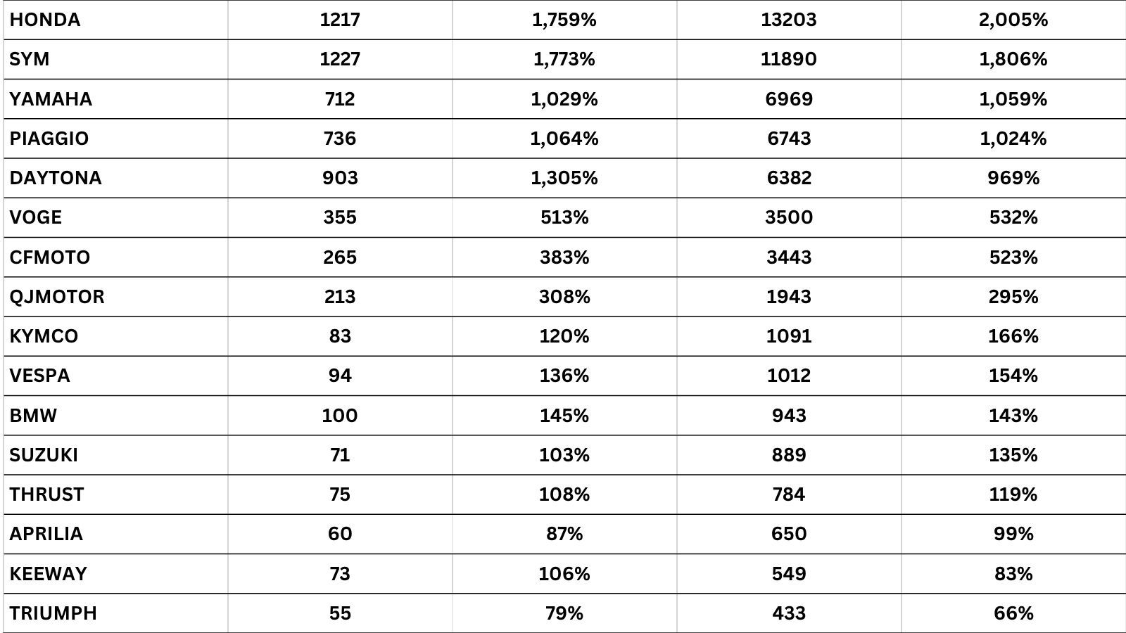 Η Honda συνεχίζει να πρωταγωνιστεί με 13.203 ταξινομήσεις και μερίδιο 20,05%, κρατώντας με διαφορά τα σκήπτρα της αγοράς. Ακολουθεί πολύ κοντά η SYM, η οποία ενισχύει τη θέση της με 11.890 μονάδες και 18,06% μερίδιο, δείχνοντας σταθερά τη δύναμή της στην κατηγορία των scooter. Στην τρίτη θέση βρίσκεται η Yamaha, με 6.969 ταξινομήσεις και 10,59% μερίδιο, επιβεβαιώνοντας την κυριαρχία του ιαπωνικού τριγώνου που εξακολουθεί να καθορίζει τις τάσεις της αγοράς. Αμέσως μετά, η Piaggio με 6.743 μονάδες (10,24%) διατηρεί σταθερή παρουσία, ενώ η Daytona ανεβαίνει εντυπωσιακά, ξεπερνώντας τις 6.382 ταξινομήσεις και αγγίζοντας το 9,69% της συνολικής αγοράς.