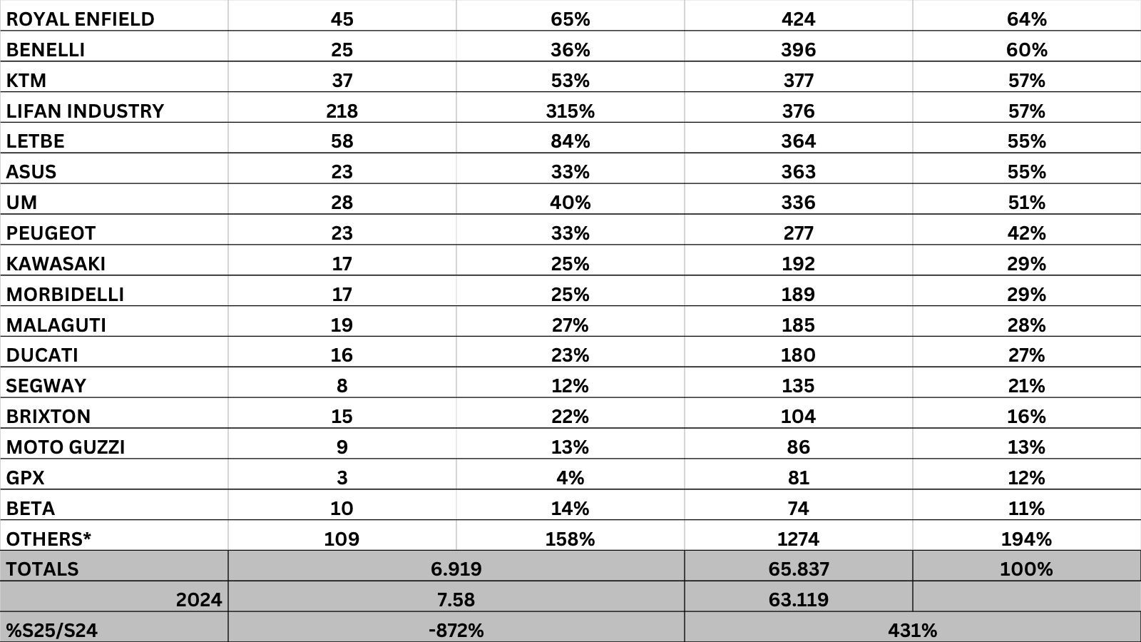 Στην κατηγορία των μικρότερων ποσοστών, οι KYMCO, Vespa, BMW, Suzuki, Thrust και Aprilia συνεχίζουν με σταθερές επιδόσεις, ενώ η Royal Enfield, η Triumph και η Benelli δείχνουν σαφές ενδιαφέρον για περαιτέρω ανάπτυξη στο premium και ρετρό κοινό. Αξιοσημείωτη είναι η παρουσία της Lifan Industry, η οποία με 376 ταξινομήσεις αρχίζει να καταγράφει αξιοπρόσεκτη πορεία. Η LETBE, η ASUS και η UM συμπληρώνουν το μεσαίο φάσμα, ενώ εταιρείες όπως οι Ducati, KTM, Moto Guzzi και Malaguti διατηρούν σταθερές, μικρές αλλά χαρακτηριστικές παρουσίες σε niche κοινά. Η συνολική εικόνα δείχνει ότι το 2025 θα κλείσει με θετικό πρόσημο, καθώς η ελληνική αγορά εξακολουθεί να επενδύει σε μοντέλα οικονομικά, ασφαλή και τεχνολογικά εξελιγμένα, με το ενδιαφέρον να εστιάζει πλέον στα Euro5+ scooters και στις value-for-money προτάσεις της μεσαίας κατηγορίας.