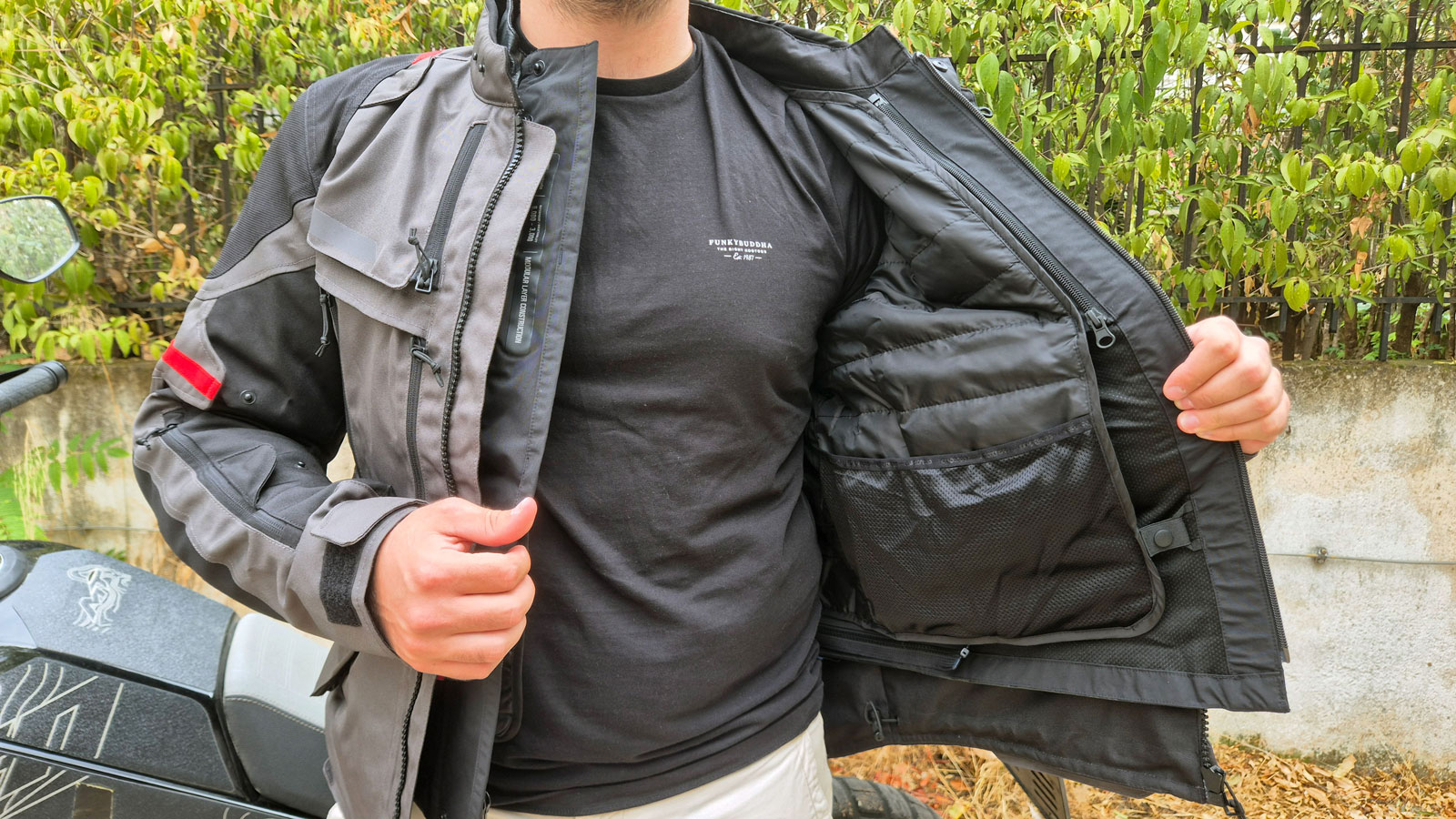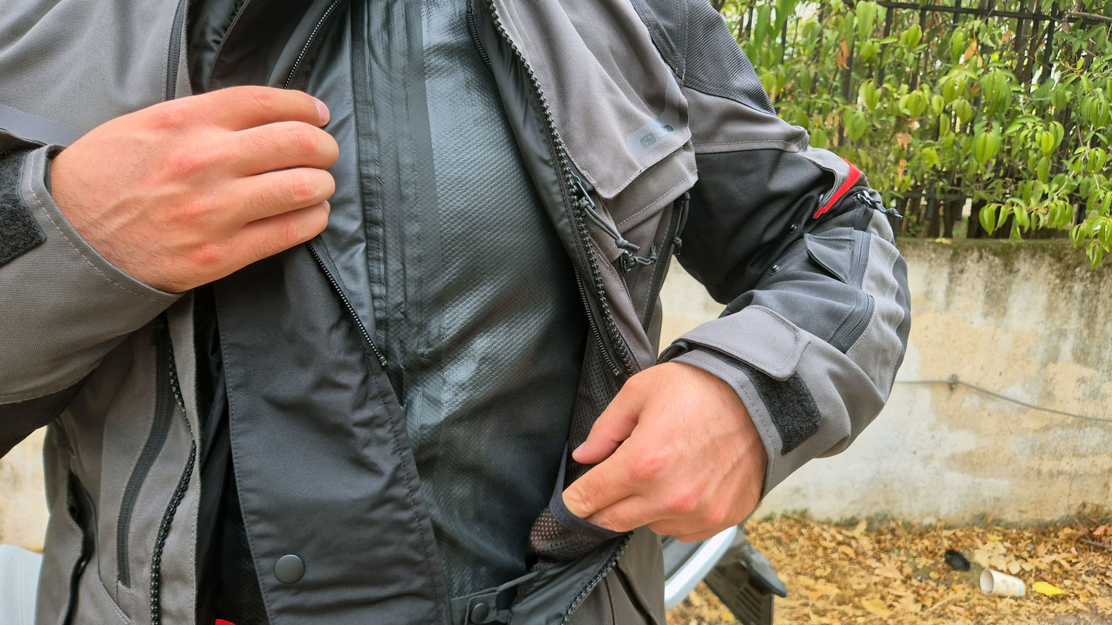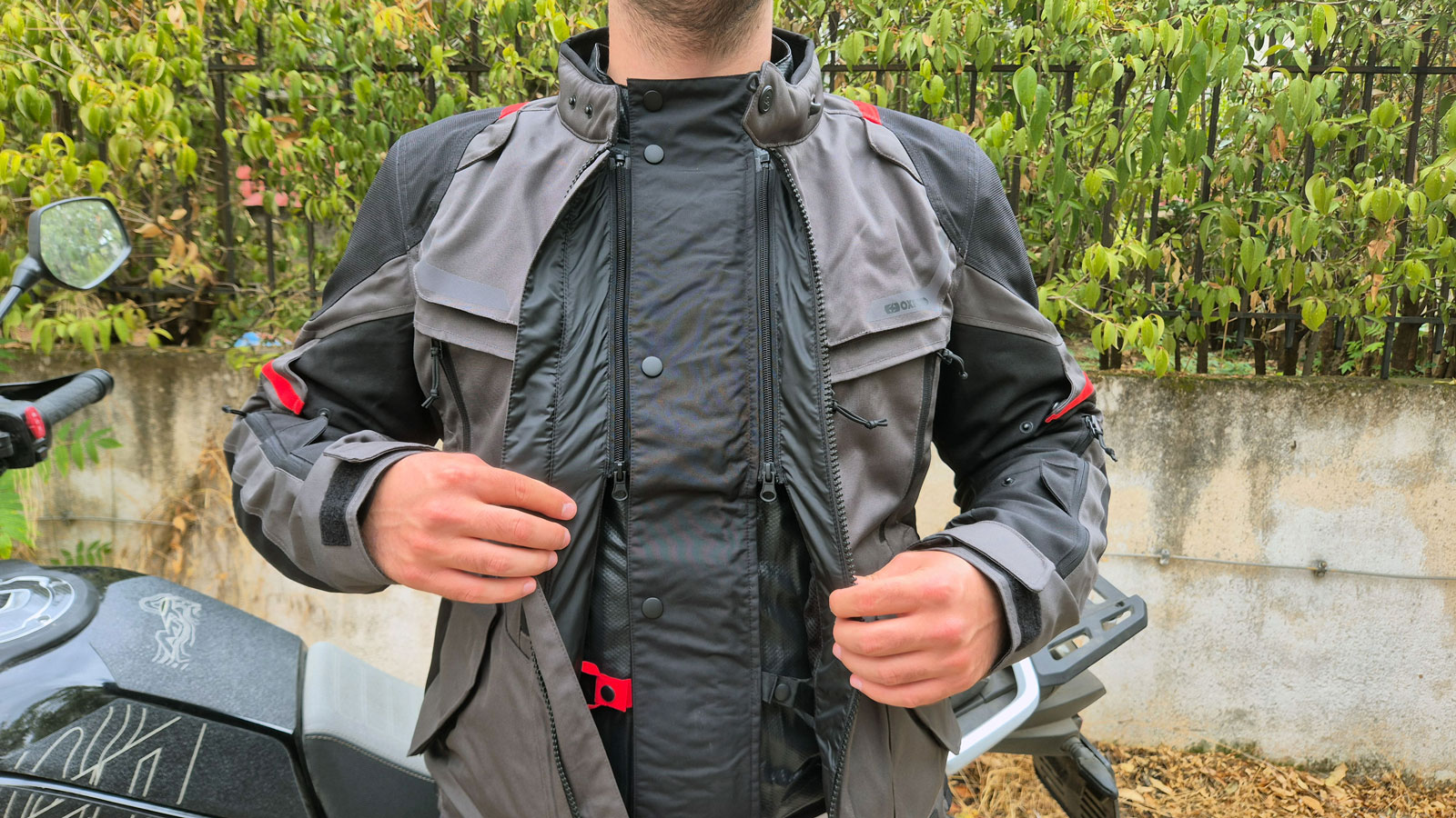 Η εφαρμογή, είναι σχετικά "true to size" και αρκετά ευρύχωρη για να επιτρέπεται η χρήση των πρόσθετων στρώσεων. Η προσαρμοστικότητα είναι εξαιρετική χάρη στους 2 ιμάντες που έχει σε κάθε πλευρά στο ύψος της μέσης και στο περιμετρικό λάστιχο που θα βρεις στο τελείωμα. Στα μανίκια, υπάρχουν κουμπιά στα μπράτσα και τους βραχίονες, ενώ στο τελείωμα κλείνουν με Velcro. Οι εξωτερικές τσέπες κλείνουν με Flaps που έχουν επίσης Velcro και δημιουργούν επικάλυψη ώστε το εσωτερικό να παραμένει στεγνό και είναι αρκετά ευρύχωρες. Τέλος, δύο φερμουάρ σύνδεσης παντελονιού, ένα σχεδόν περιμετρικό στην αδιάβροχη επένδυση και ένα πιο μικρό σε μήκος στο βασικό μπουφάν, θα φροντίσουν ώστε να μην σου πέφτει το παντελόνι κάνοντας την οδήγηση ακόμα πιο άνετη.