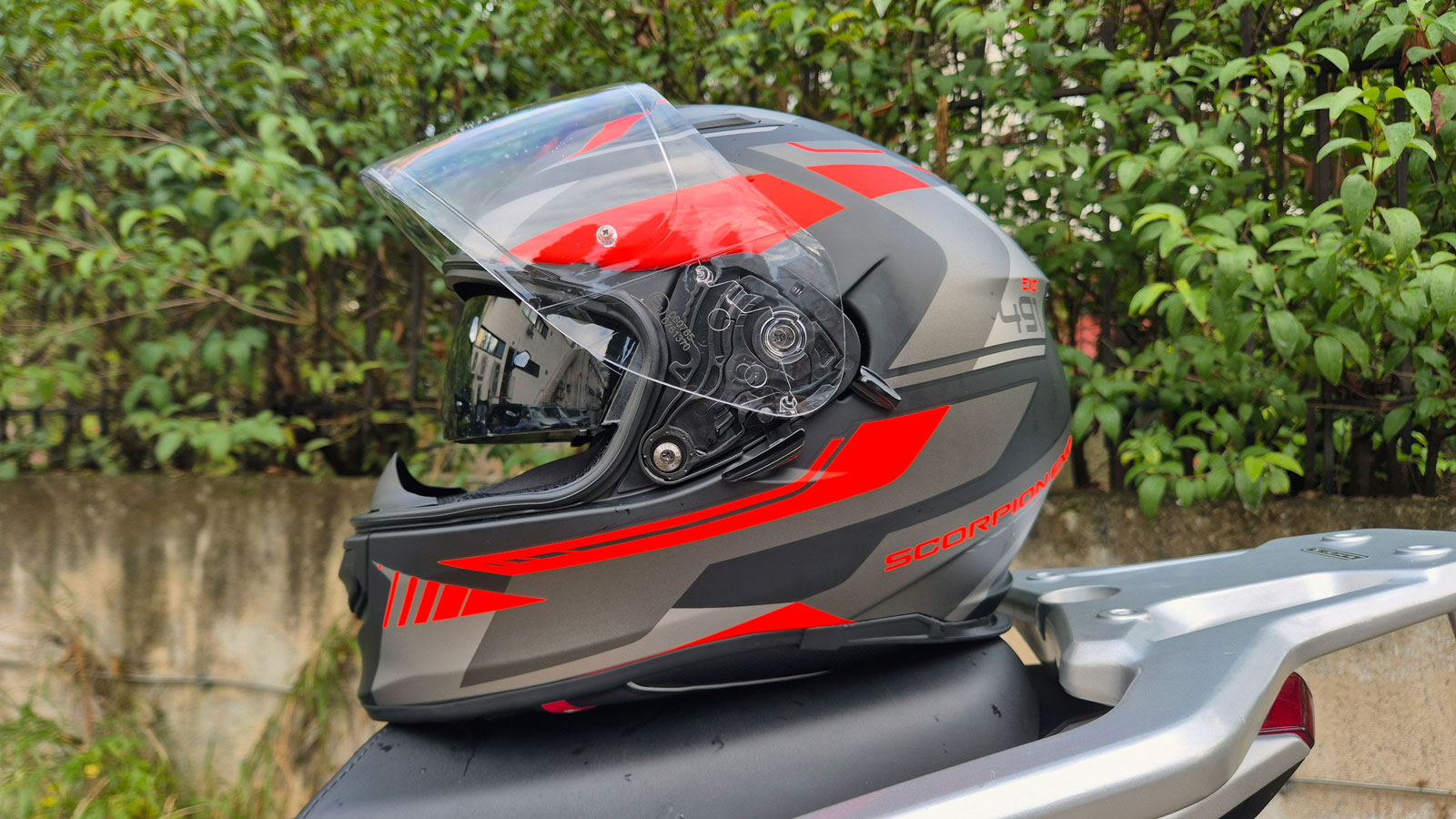 Εκτός από τις Premium επιλογές της Scorpion-Exo, στην γκάμα της θα βρεις και πιο προσιτά κράνη, τα οποία όμως κατασκευάζονται με τα ίδια αυστηρά standards, κρατώντας τον πήχη της ποιότητας όλων των προϊόντων της εταιρείας ψηλά. Πήραμε λοιπόν στα χέρια μας για μία πλήρη δοκιμή το Scorpion-Exo 491 Abilis, ένα Full Face κράνος με κέλυφος από πεπιεσμένο πολυκαρβονικό υλικό που στην τιμή των 170 ευρώ έχει εξαιρετικά χαρακτηριστικά. Κάτω από το κέλυφος τοποθετείται το πολυπυκνωτικό αφρώδες EPS της Scorpion, που διαχέει τις δυνάμεις κρούσης στην μεγαλύτερη δυνατή επιφάνεια ώστε να προστατεύει το κεφάλι. Ζυγίσαμε το βάρος του κράνους σε Small μέγεθος στα 1.525 γραμμάρια, ένα τίμιο νούμερο για τα δεδομένα της κατηγορίας σε συνδυασμό με τον μηχανισμό και την ύπαρξη της εσωτερικής ζελατίνας.