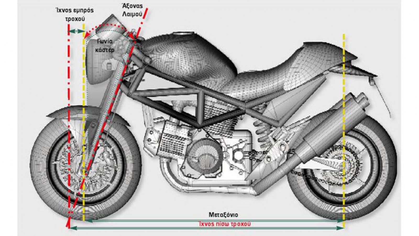 Στοιχεία όπως η σταθερότητα και η ευελιξία της μοτοσικλέτας, ορίζονται από τρία μεγέθη που συνθέτουν τη λεγόμενη «γεωμετρία της μοτοσικλέτας».