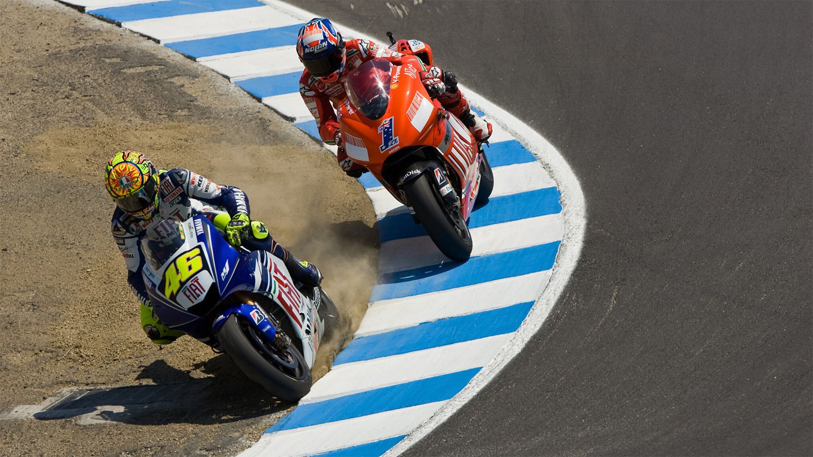 Ο αγώνας της Laguna Seca το 2008 στα MotoGP έμεινε στην ιστορία, για την απίστευτη μάχη Stoner-Rossi αλλά και το εξαιρετικά αμφιλεγόμενο προσπέρασμα του δεύτερου στον πρώτο, στην στροφή «Corkscrew». Τότε ο Rossi είχε χαρακτηριστικά περάσει τον Stoner πατώντας ξεκάθαρα και στην αμμοπαγίδα, με τον Αυστραλό να προσπαθεί να κρατήσει την θέση του και να μην τα καταφέρνει… Αυτή ήταν μια στιγμή που εξασφάλισε πολλούς… εχθρούς για τον Rossi, αφού τον κατηγόρησαν ότι δεν σεβάστηκε τα όρια της πίστας. Ωστόσο, η νίκη περιήλθε τελικά στον «Γιατρό» και δεν του αφαιρέθηκε ποτέ.