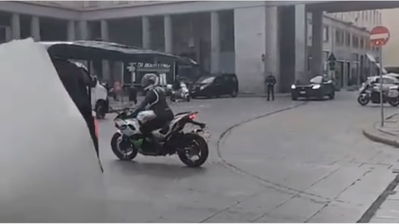 Στο βίντεο που δημοσίευσε η εφημερίδα Torino Cronaca στο Instagram, μπορούμε να δούμε μια μοτοσυκλέτα που μισοκαλύπεται από ένα βανάκι, το οποίο έχει τις πόρτες του ανοιχτές και κάποιος μέσα τραβάει φωτογραφίες ή βίντεο.