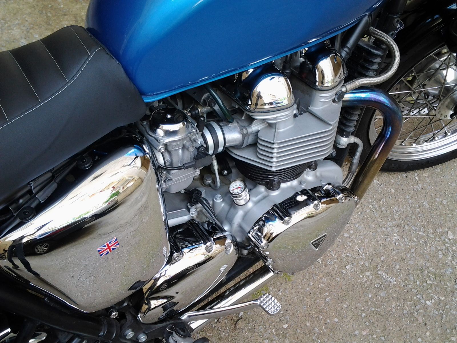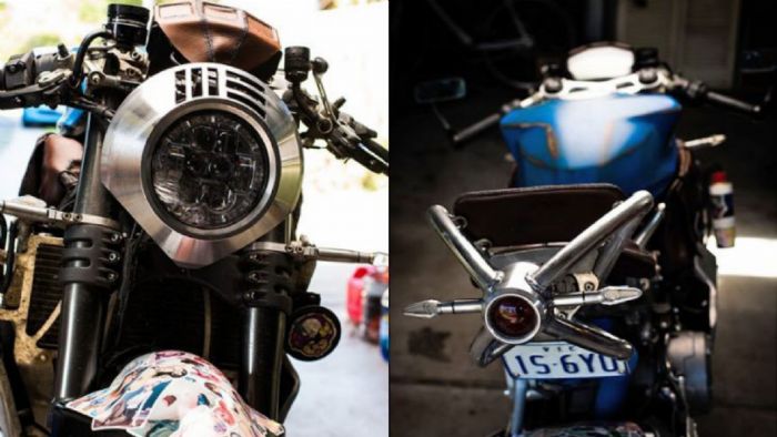 Σειρά είχε η εξάτμιση της οποίας οι σωληνώσεις βάφτηκαν στο μπλε χρώμα της μοτοσυκλέτας και τοποθετήθηκε ένα χειροποίητο τελικό ιδιαίτερης σχεδίασης, του οποίου τα καυσαέρια βγαίνουν αντίθετα από ότι έχουμε συνηθίσει.