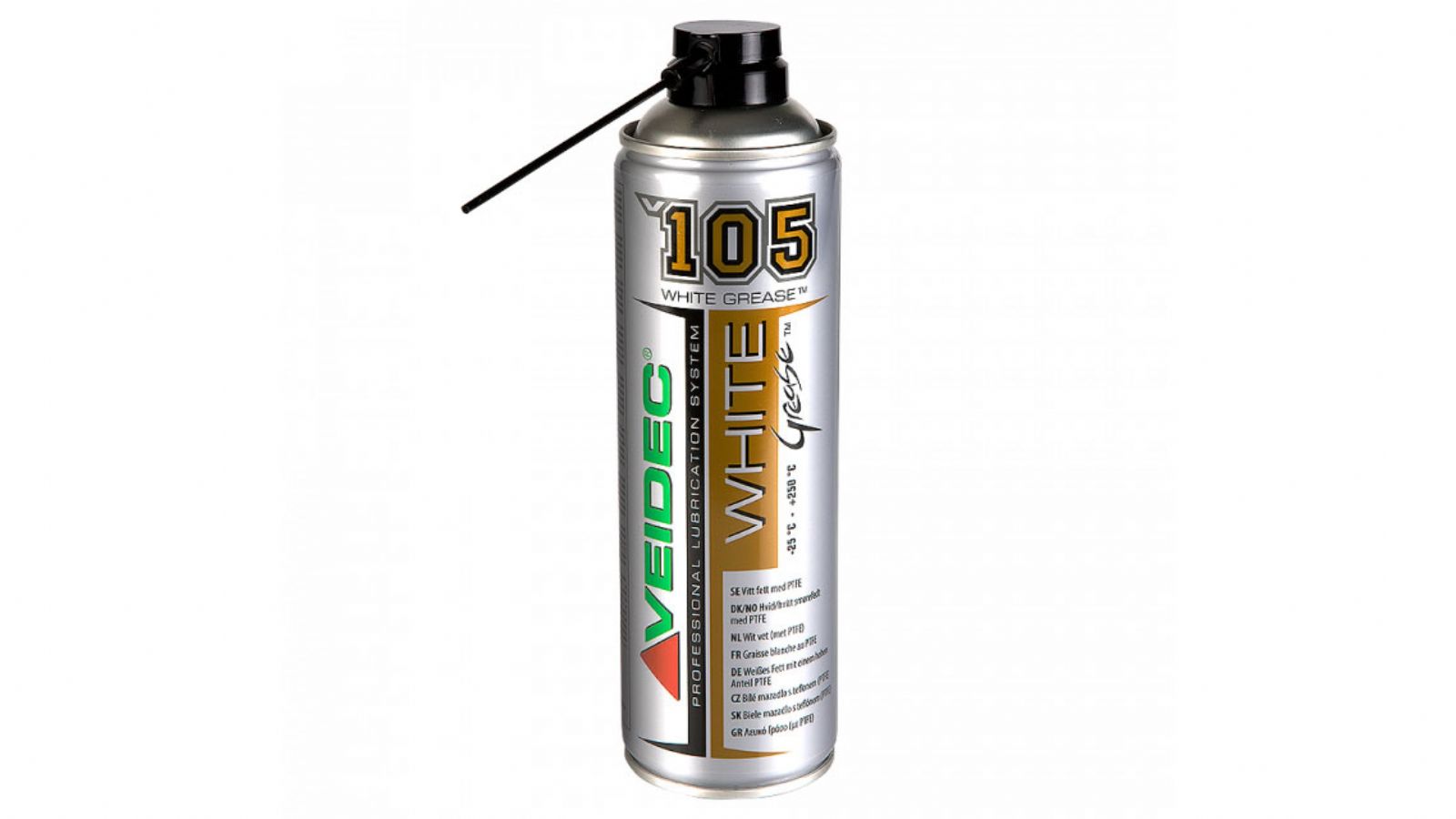 Λευκό γράσο λιθίου της VEIDEC σε μορφή σπρέι με μοναδική πρόσφυση, για μακροχρόνια λίπανση και προστασία από την τριβή και τη σκουριά.