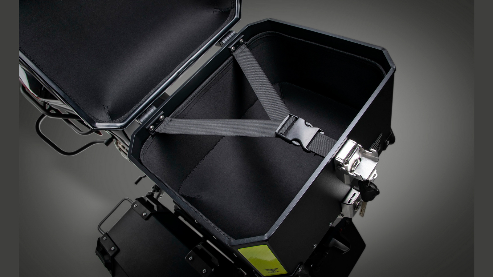 Πρόκειται για μια κορυφαίων προδιαγραφών εργοστασιακή βαλίτσα Top Case χωρητικότητας 40 λίτρων, κατασκευασμένη από αλουμίνιο και με σημασία στη λεπτομέρεια. Όπως για παράδειγμα ιμάντες συγκράτησης, εσωτερική μαλακή επένδυση, προστατευτικά στο εξωτερικό κέλυφος, ανακλαστικά αυτοκόλλητα, χειρολαβές μεταφοράς καθώς και ανάγλυφο λογότυπο της Voge!