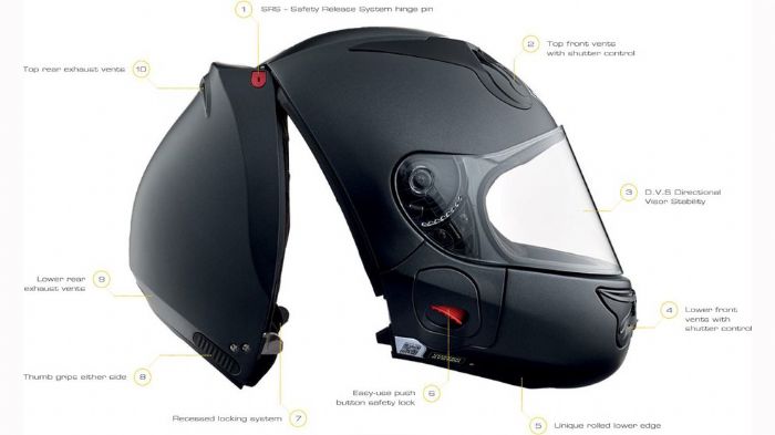 Στη συνέχει το πίσω αρθρωτό μέρος του κράνους κλείνει και ασφαλίζει, δημιουργώντας το απαραίτητο προστατευτικό κέλυφος γύρω από το κεφάλι του οδηγού.