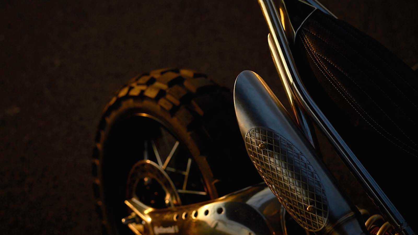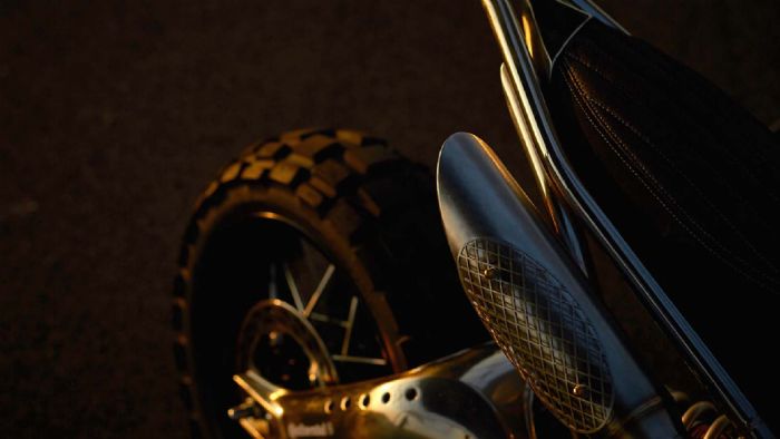 Οι ακτινωτοί τροχοί είναι της Borrani, μιας μιλανέζικης εταιρείας, ενώ η εξάτμιση είναι μάλλον… εκκωφαντική, αν κρίνουμε μόνο από την εμφάνισή της! Η σέλα ντύθηκε σε alcantara και δέρμα, ενώ το πλαίσιο της μοτοσυκλέτας υπέστη βούρτσισμα και βερνικάρισμα.