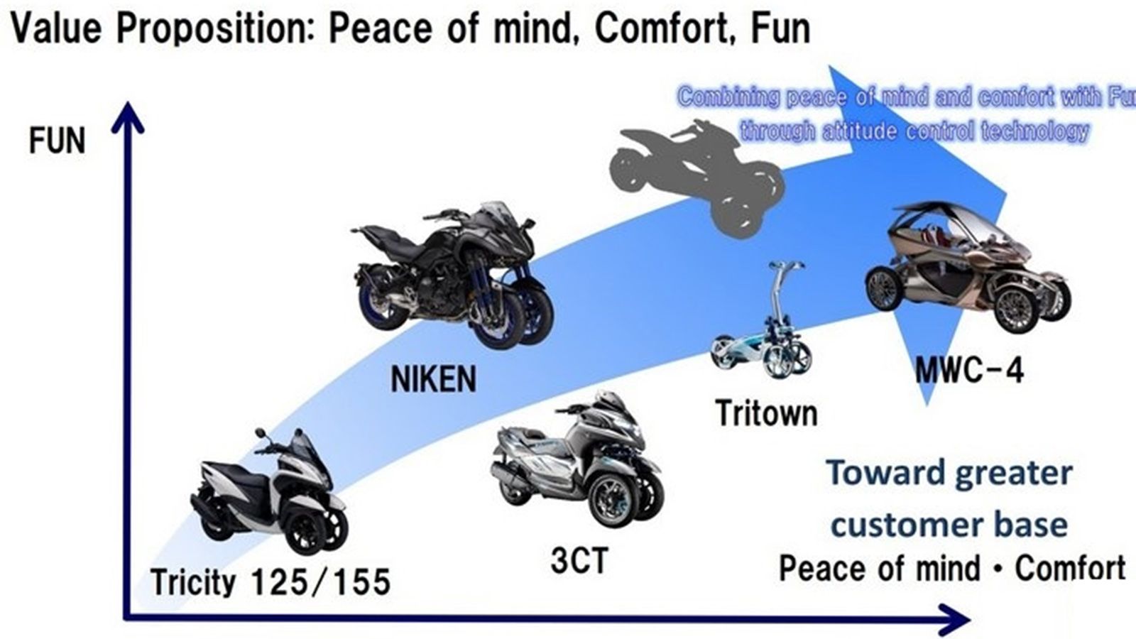 Παράλληλα με το μυστηριώδες αυτό νέο μοντέλο, η Yamaha επιδεικνύει 2 οχήματα ακόμα: Το τρίτροχο, ηλεκτροκίνητο Tritown, που θα έχει την μορφή scooter αστικής μετακίνησης και δεν θα απαιτεί καν δίπλωμα, για να χρησιμοποιηθεί! Το άλλο, που βρίσκεται στο δεξί άκρο του διαγράμματος, ονομάζεται MWC-4 και είναι ένα τετράτροχο εναλλακτικό αυτοκινήτου όχημα, με δυνατότηα κλίσεων. Θα κινείται από ηλεκτρικό μοτέρ, που θα συνδυάζεται με ζεύγος κινητήρα-γεννήτριας για την αύξηση της αυτονομίας.