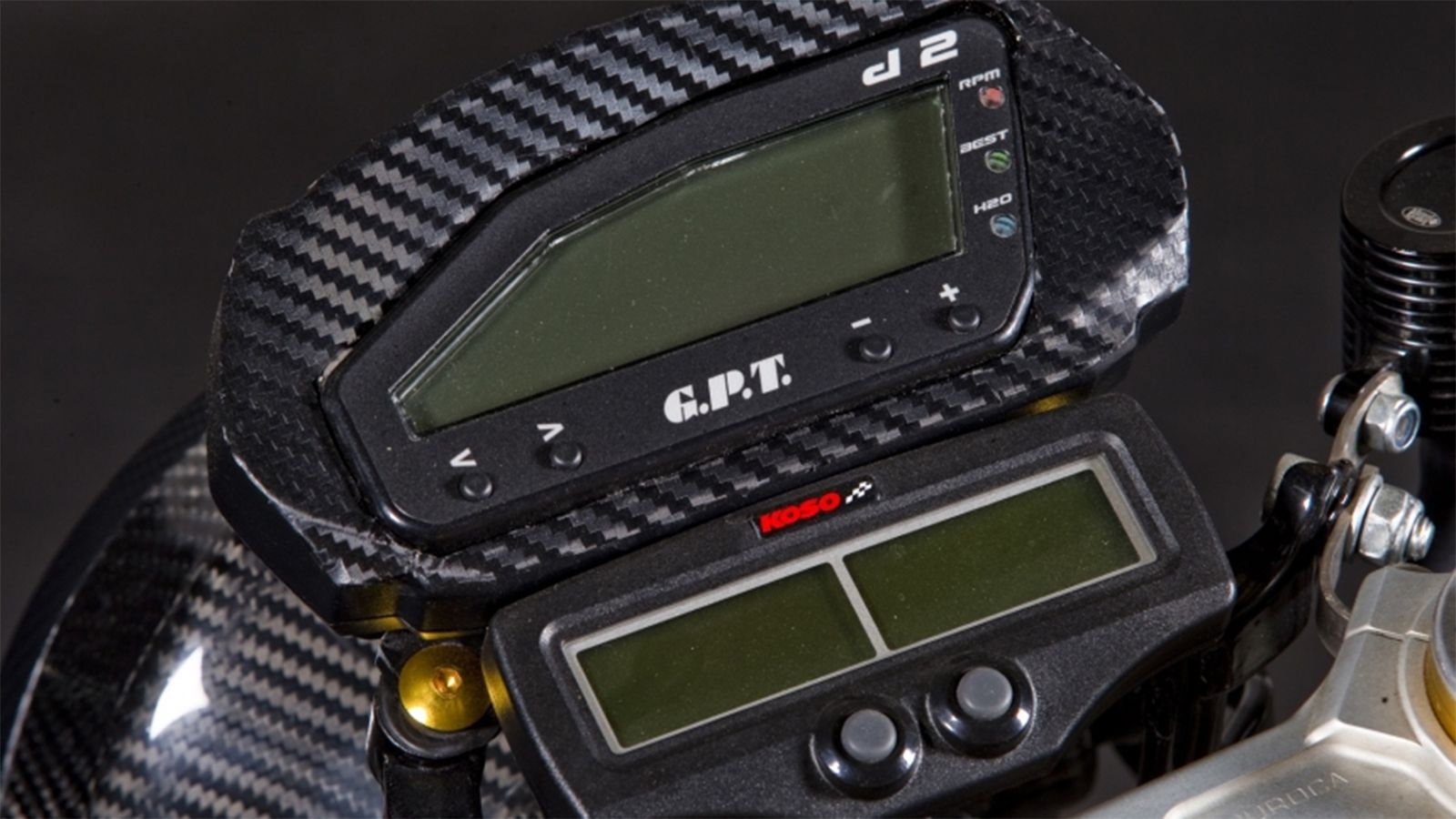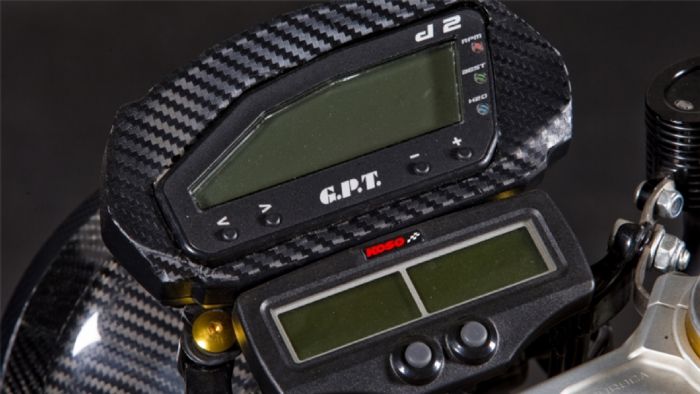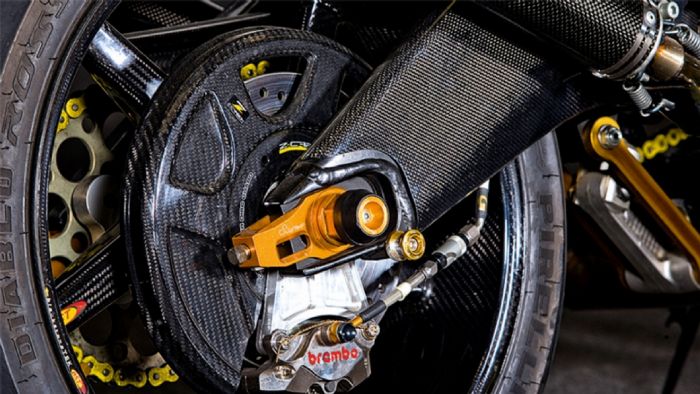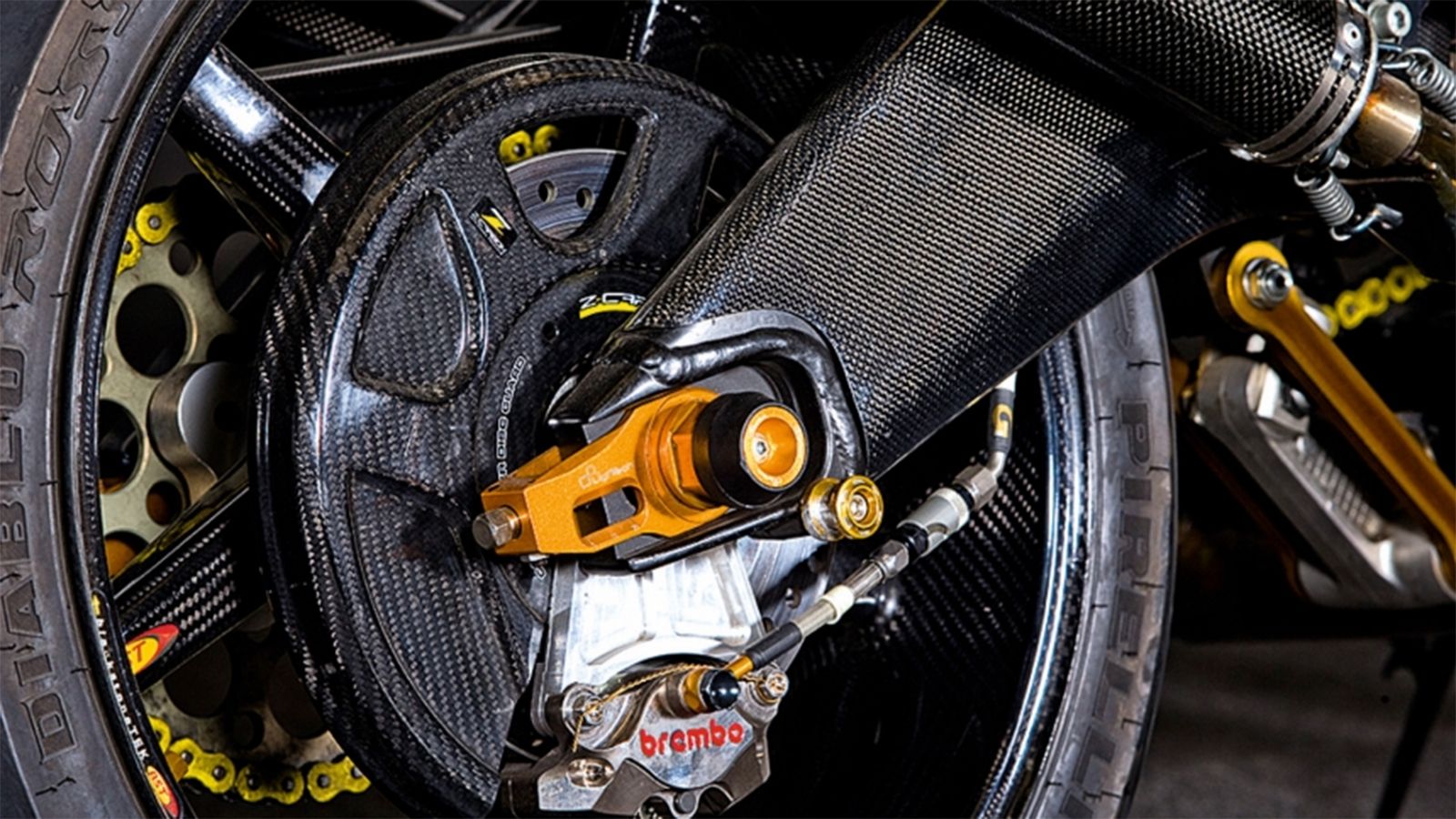 Το πιρούνι εμπρός έχει αντικατασταθεί από ένα ανεστραμμένο Ohlins από μία Aprilia RSV1000 και το ψαλίδι προέρχεται από ένα Yamaha R6. Ohlins είναι και το πίσω αμορτισέρ που έχει χρησιμοποιηθεί, ενώ το ανθρακόνημα είναι –όπως βλέπετε-διάχυτο στη μοτοσυκλέτα. Τέλος, το πλήρως ψηφιακό όργανο του μοντέλου απεικονίζει μεταξύ άλλων, την θερμοκρασία του κάθε κυλίνδρου ξεχωριστά!