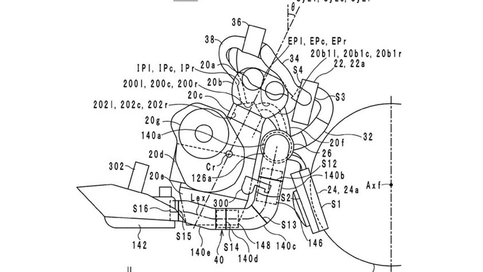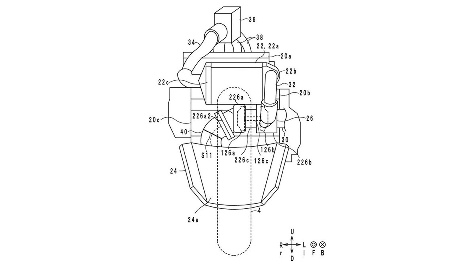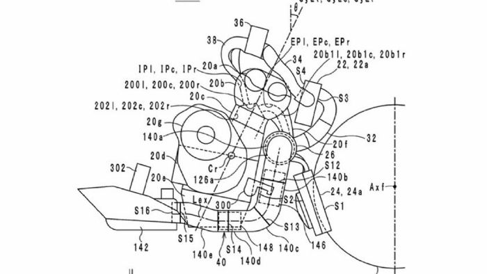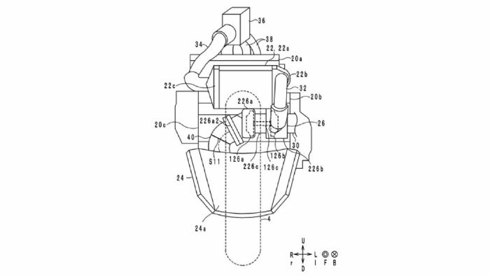 Πιο συγκεκριμένα, τα σχέδια που βλέπετε εδώ αφορούν την νέα μοτοσυκλέτα και επιμέρους τμήματα της. Ο ίδιος ο στροβιλοσυμπιεστής θα βρίσκεται ακριβώς μπροστά από τους κυλίνδρους, προφανώς για να μειωθεί στο ελάχιστο δυνατό το μήκος του αυλού προς το turbo. Το σύστημα θα φέρει επίσης και intercooler, το οποίο είναι τοποθετημένο στην θέση του ψυγείου, ενώ το τελευταίο τοποθετείται σε μια νέα θέση, χαμηλά στην μοτοσυκλέτα και στο εμπρός μέρος της καρίνας. Το σύστημα εισαγωγής θα αποτελείται από έναν αγωγό που θα χωρίζεται σε 3 αυλούς (έναν για κάθε κύλινδρο), ενώ μια κεντρικά τοποθετημένη πεταλούδα γκαζιού αναλαμβάνει την ρύθμιση της ισχύος.