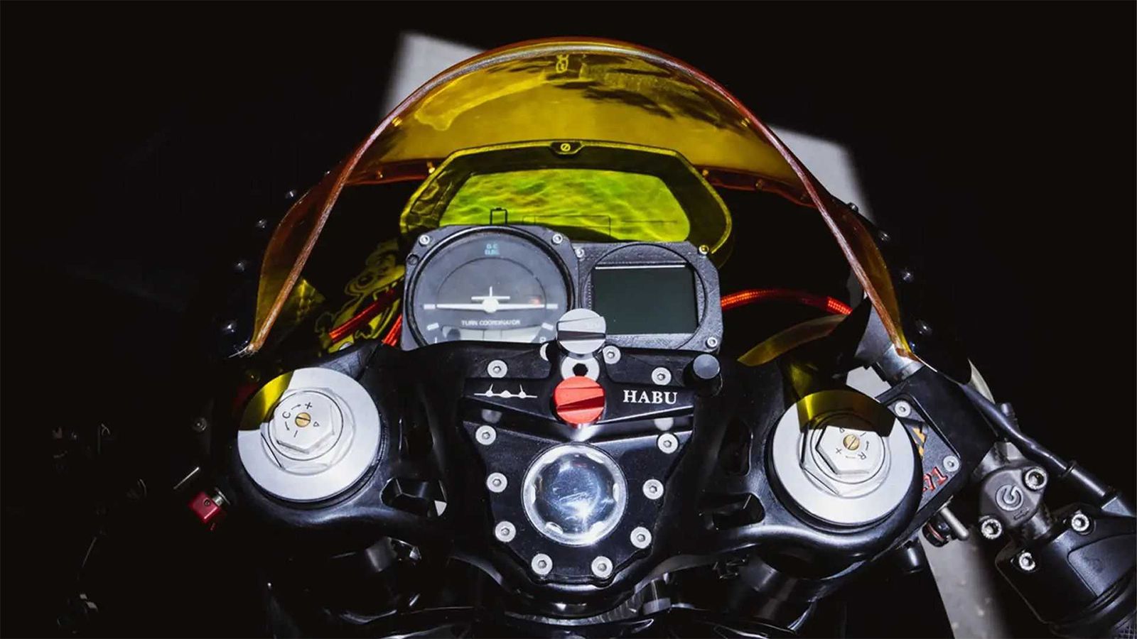 Εντύπωση προκαλεί η χρήση δύο οργάνων τύπου αεροσκάφους: Μια οθόνη και έναν… turn coordinator με το αεροπλανάκι πάνω! Αυτό το όργανο χρησιμοποιείται για να δείχνει στον πιλότο, τον ρυθμό στροφής ενός αεροσκάφους και είμαστε περίεργοι, για το πώς λειτουργεί στην περίπτωση μιας μοτοσυκλέτας…