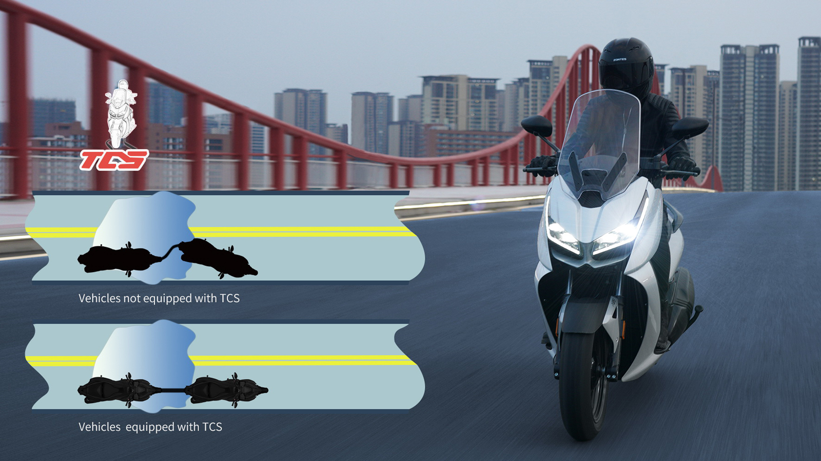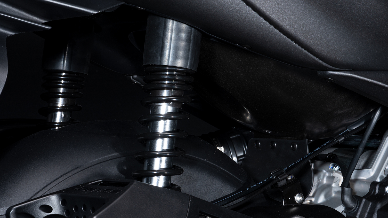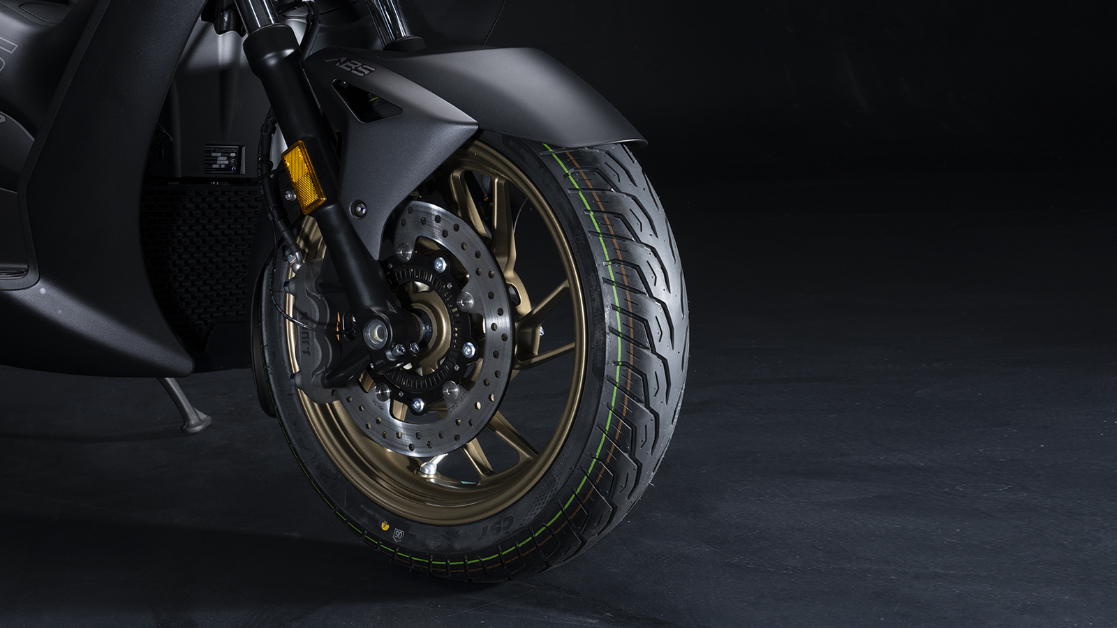 Στον πλούσιο στάνταρ εξοπλισμό περιλαμβάνεται Traction Control το οποίο φροντίζει για την βέλτιστη κατανομή της δύναμης στην άσφαλτο και ενισχύει την ασφάλεια του αναβάτη σε συνθήκες βρεγμένου οδοστρώματος. Παράλληλα διαθέτει δύο Power Modes, το E για πιο οικονομική οδήγηση και το S για μία πιο δυναμική απόκριση του γκαζιού, τα οποία αλλάζει ο αναβάτης μέσω ενός κουμπιού στο δεξί του χέρι. Μάλιστα, το σύστημα περνάει αυτόματα στην χαρτογράφηση S μόλις οι στροφές του κινητήρα ξεπεράσουν τις 7.000, ώστε να εξασφαλίζεται άμεση απόκριση, για παράδειγμα σε περίπτωση προσπέρασης. Ένα ακόμα σύστημα ασφαλείας που δίνει το παρόν είναι οι αισθητήρες ελέγχου της πίεσης και της θερμοκρασίας των ελαστικών, που συνδράμουν στην σωστή οδηγική συμπεριφορά του scooter και την μείωση της κατανάλωσης, αφού προειδοποιούν τον αναβάτη μέσω ένδειξης στην οθόνη ώστε να φέρει τις πιέσεις των ελαστικών του στα σωστά επίπεδα. Οι διαστάσεις των ελαστικών του είναι 120/70 εμπρός και 140/70 πίσω και τοποθετούνται σε τροχούς 15 και 14 ιντσών αντίστοιχα.