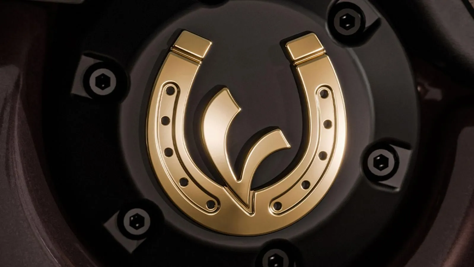 Το μοντέλο ξεχωρίζει με το αποκλειστικό χρώμα καφέ bay, μια βαθιά, γυαλιστερή απόχρωση που παραπέμπει στο σκούρο τρίχωμα του αλόγου. Το ατσάλινο σώμα συνδυάζει ματ και γυαλιστερά φινιρίσματα, δημιουργώντας έντονες αντιθέσεις, ενώ οι χρυσές λεπτομέρειες προσδίδουν πολυτελή χαρακτήρα. Κάτω από τη σέλα δεσπόζει το ανάγλυφο μονόγραμμα V στο κέντρο ενός πετάλου, ενισχύοντας τον συμβολισμό της έκδοσης.