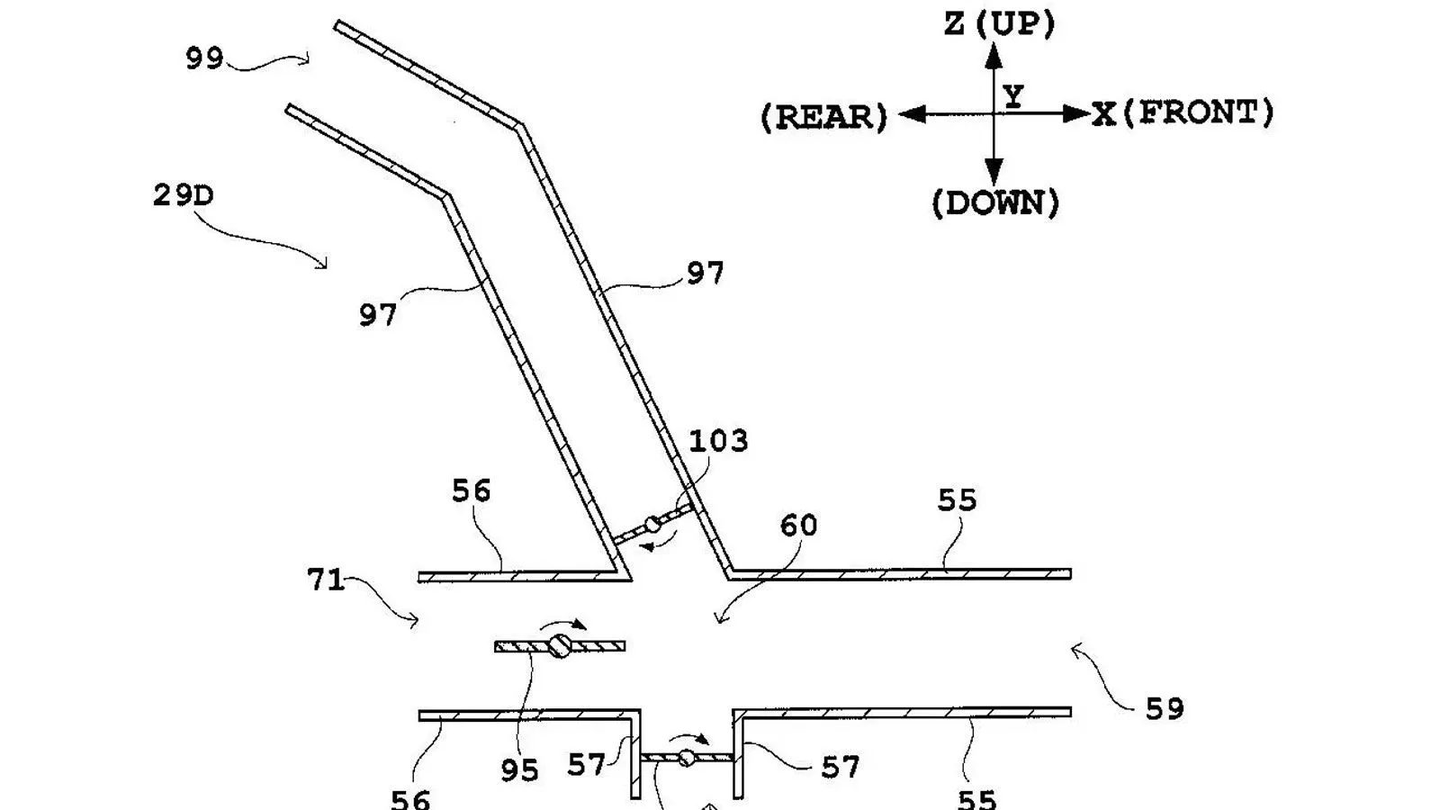 Η δεύτερη πατέντα εφαρμόζει την ίδια λογική αλλά στηρίζεται σε εξαγωγή που κοιτάει προς τα κάτω. Όταν η μοτοσυκλέτα βρίσκεται σε βαθιά κλίση μέσα στη στροφή, δεν μπορεί να αξιοποιήσει όλη τη δύναμη του κινητήρα, άρα μέρος των καυσαερίων μπορεί να εκτραπεί σε ένα λεπτό κανάλι που φυσάει προς το έδαφος. Λόγω του μεγάλου βαθμού κλίσης, αυτός ο πίδακας καυσαερίων εκτρέπεται ουσιαστικά προς τα έξω, προσφέροντας μια μικρή «ώθηση» που βοηθά τη μοτοσυκλέτα να διατηρήσει γραμμή και σταθερότητα. Μια πιο προηγμένη εκδοχή του συστήματος περιλαμβάνει δύο επιπλέον εξόδους—αριστερή και δεξιά—ώστε η μοτοσυκλέτα να μπορεί να χρησιμοποιεί κατευθυνόμενη ώθηση ακόμη και με μικρότερες κλίσεις ή σε διαφορετικές φάσεις της στροφής.