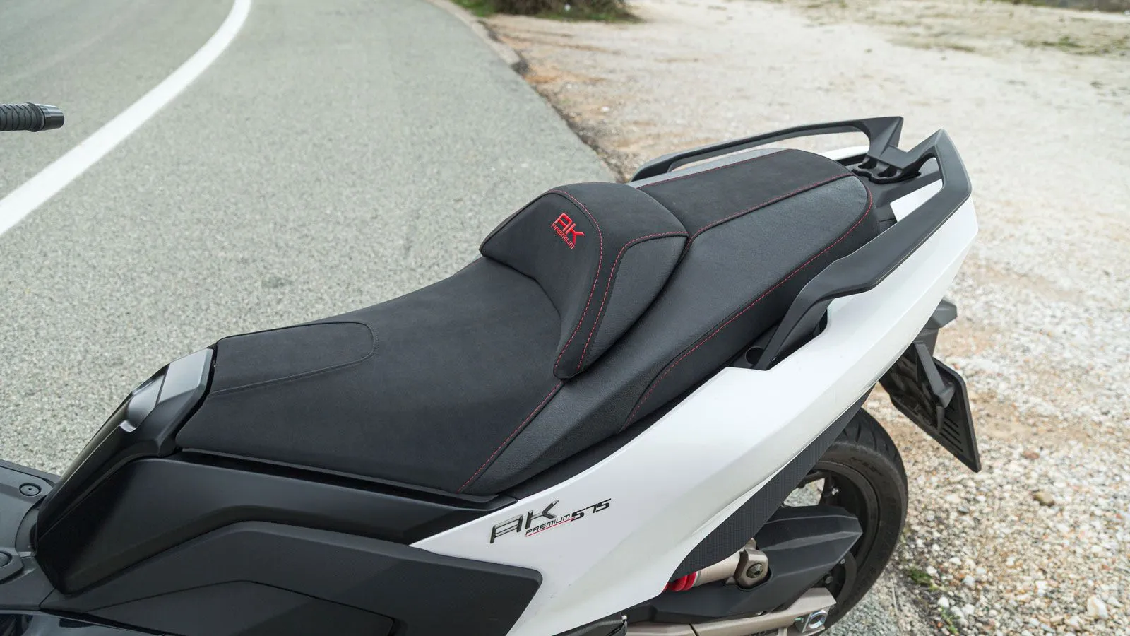 Η φαρδιά σέλα με κόκκινες ραφές και alcantara λεπτομέρειες ενισχύει τον premium χαρακτήρα. Το ύψος σέλας στα 790 mm και ο εργονομικός σχεδιασμός επιτρέπουν εύκολη πρόσβαση στο έδαφος, παρά το φαρδύ κεντρικό τούνελ.