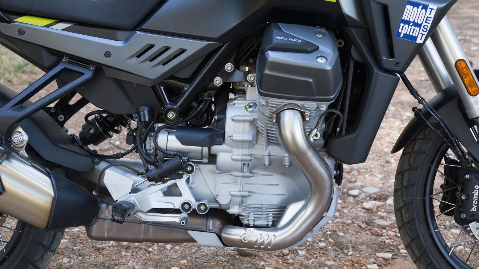 Η μονάδα, που γνωρίσαμε στο V100 Mandello, αποδίδει 115 ίππους στις 8.800 σ.α.λ. και 105 Nm στις 6.750 σ.α.λ., με το 82% της ροπής διαθέσιμο από τις 3.500 σ.α.λ. Ο κινητήρας λειτουργεί ομαλά σε όλο το φάσμα στροφών, αλλάζει χαρακτήρα ανάλογα με το επιλεγμένο Riding Mode και προσφέρει άμεση, γεμάτη απόκριση ειδικά στο Sport. Στις μετρήσεις μας η Stelvio κατέγραψε 0–100 χλμ./ώρα σε 4,1”, ενώ η μέση κατανάλωση έφτασε τα 6,6 λτ./100 χλμ.. Το εξατάχυτο κιβώτιο και ο άξονας τελικής μετάδοσης συνθέτουν ένα σύνολο που ευνοεί τη μακροχρόνια χρήση και τη σταθερότητα.