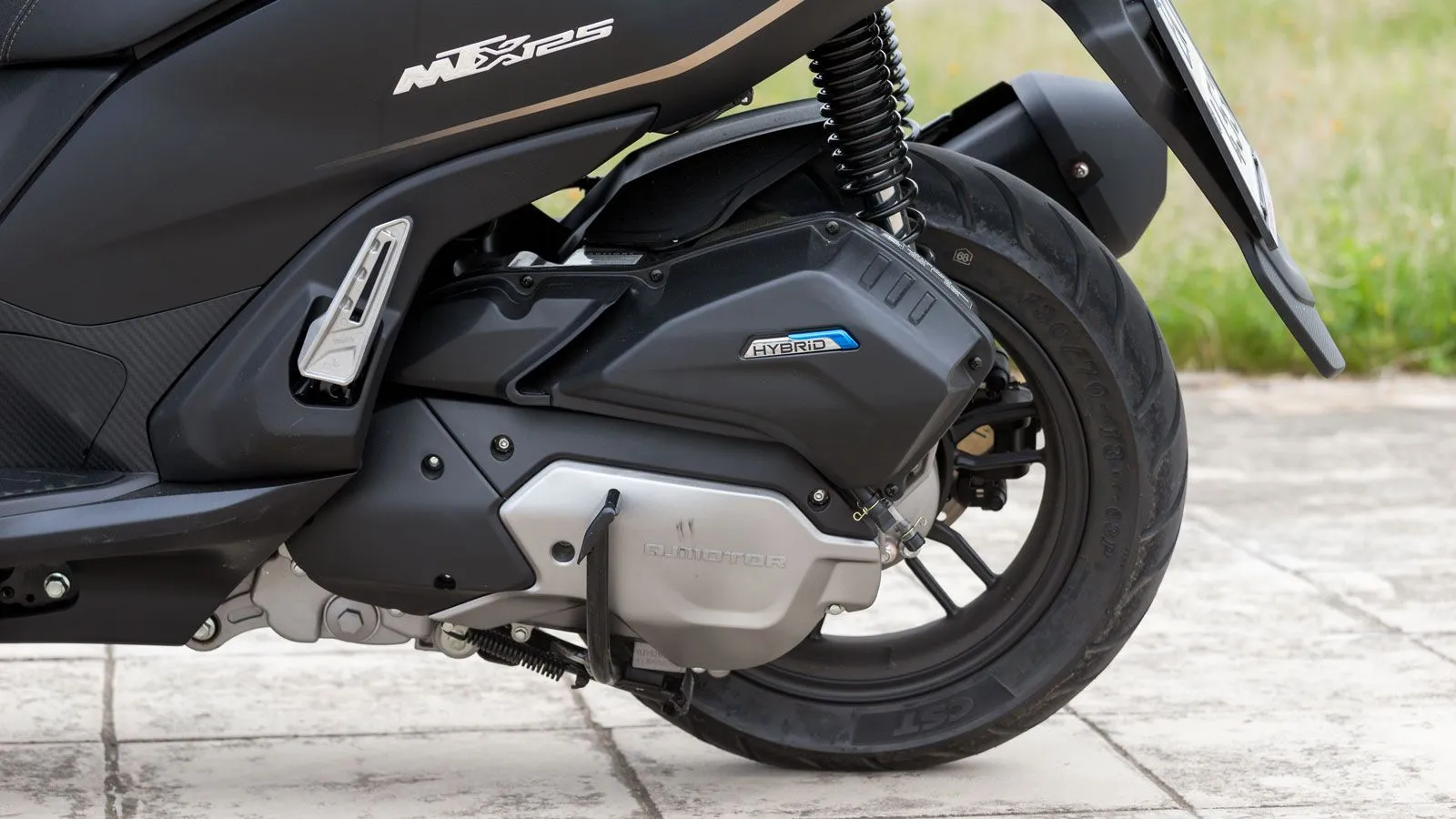 Ιδιαίτερο ενδιαφέρον παρουσιάζει η υβριδική λειτουργία, όπου η συμβατική μίζα αντικαθίσταται από γεννήτρια που αναλαμβάνει τόσο την εκκίνηση όσο και υποβοήθηση στην επιτάχυνση, μειώνοντας φθορές και κατανάλωση. Το Traction Control περιλαμβάνεται στον στάνταρ εξοπλισμό και μπορεί να απενεργοποιηθεί από το μενού της οθόνης, δίνοντας στον αναβάτη μεγαλύτερο έλεγχο ανάλογα με τις συνθήκες. Με ρεζερβουάρ 8 λίτρων, το MTX 125 προσφέρει αυτονομία άνω των 250 χιλιομέτρων, στοιχείο που ενισχύει τον πρακτικό του χαρακτήρα.