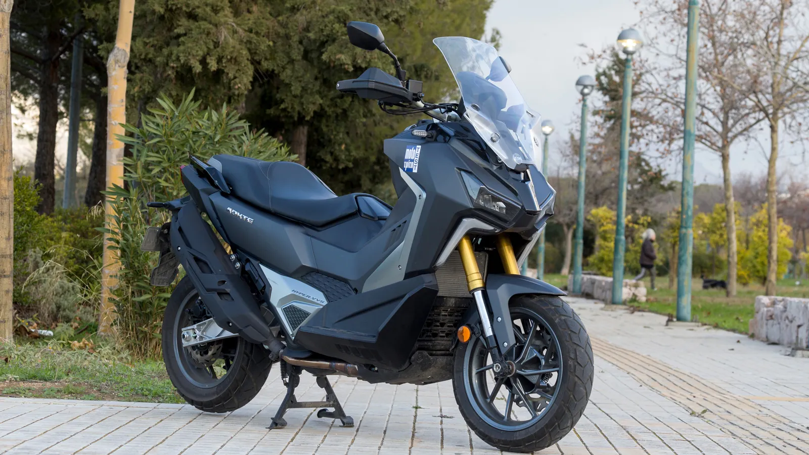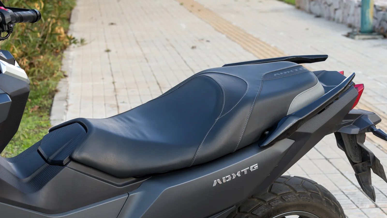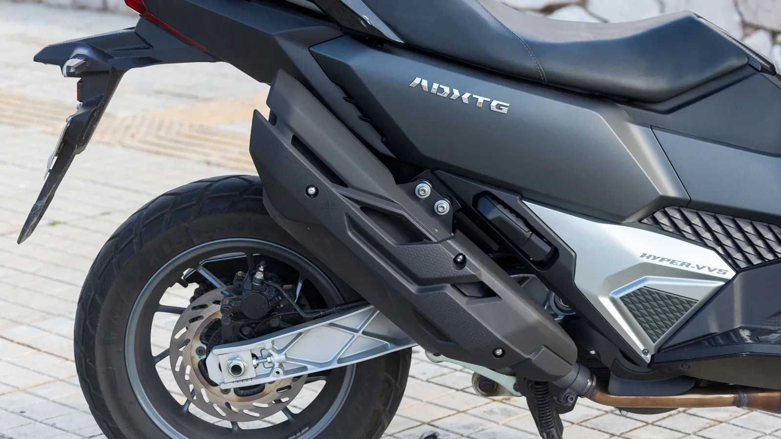 Τα φώτα ημέρας DRL σε σχήμα κυνόδοντα κάτω από τους διπλούς LED προβολείς δημιουργούν ξεχωριστή ταυτότητα, ενώ πίσω το φωτιστικό σώμα σε σχήμα Μ ολοκληρώνει ένα επιβλητικό σύνολο. Οι χούφτες, η ποδιά κινητήρα και το ανασηκωμένο τελικό εξάτμισης ενισχύουν τον adventure χαρακτήρα, δείχνοντας πως το ADXTG δεν σχεδιάστηκε μόνο για αστική χρήση.