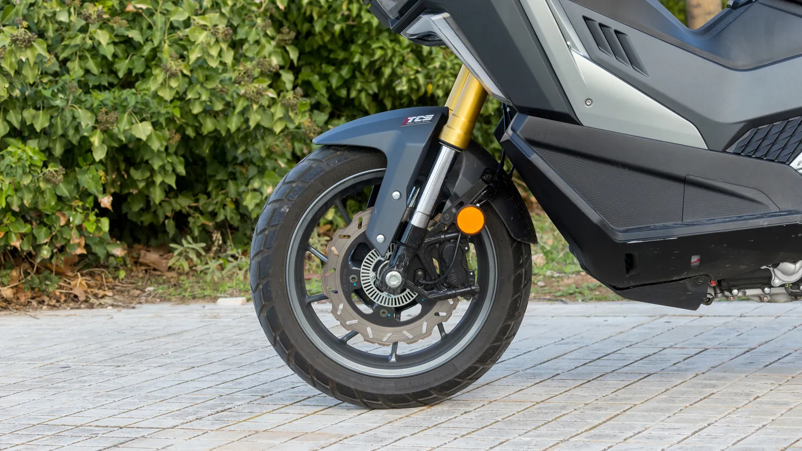 Μπροστά υπάρχει ανεστραμμένο πιρούνι 41 mm, ενώ η απόσταση 160 mm από το έδαφος δείχνει ξεκάθαρα τον crossover προσανατολισμό. Στα φρένα συναντάμε εμπρός δίσκο 275 mm με ακτινική τετραπίστονη δαγκάνα και πίσω δίσκο 233 mm.