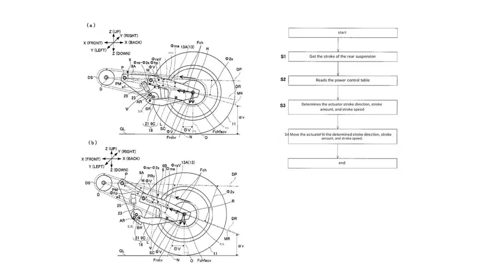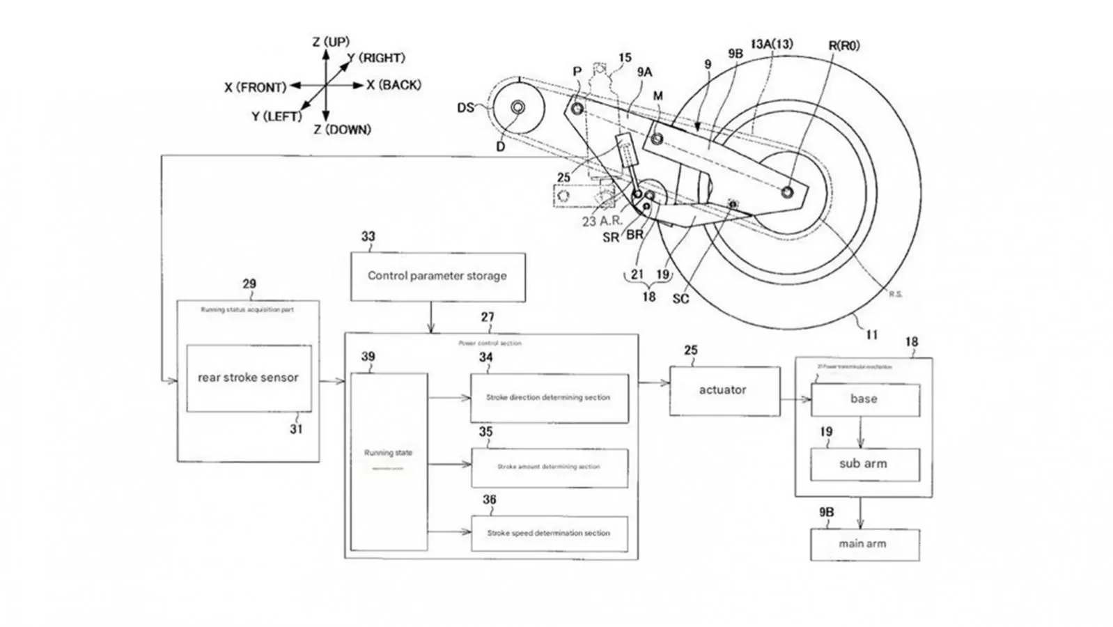 Η πατέντα περιγράφει σύστημα που ελέγχεται από ενεργοποιητή με παροχή ισχύος και λειτουργεί βάσει δεδομένων από αισθητήρες, όπως επιτάχυνση, φρενάρισμα και γωνία κλίσης. Πρόκειται για πλήρως ενεργή μεταβολή γεωμετρίας, κάτι που δεν επιτρέπεται στους κανονισμούς του MotoGP.