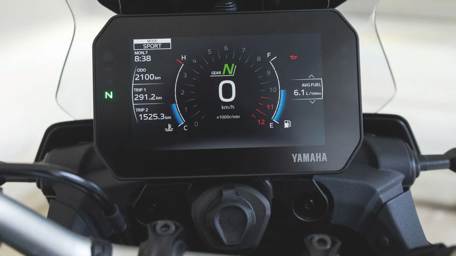 Η νέα TFT οθόνη 7 ιντσών, με τρεις θεματικές απεικόνισης και θύρα USB-C, πλαισιώνεται από ανασχεδιασμένους διακόπτες με τετρακατευθυντικό joystick. Τα φλας διαθέτουν αυτόματη ακύρωση και Emergency Stop Signal, ενώ ο νέος προβολέας τύπου “arrow head” ενσωματώνει cornering φωτισμό για βέλτιστη ορατότητα στις στροφές. Η αισθητική του εμπρός μέρους έχει γίνει πιο δυναμική, τονίζοντας τον sport-touring χαρακτήρα.