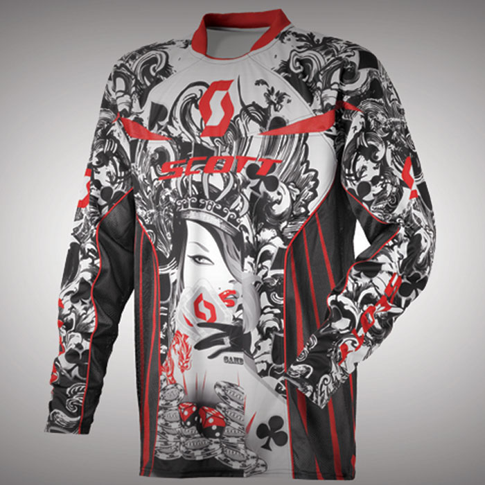 | Jersey με TPR γραφικά από την εταιρεία Scott. Είναι κατασκευασμένο από polyester και συνθετικά υλικά που επιτρέπουν την αναπνοή του σώματος και απορροφούν τον ιδρώτα. Διαθέτει τμήματα από lycra και «V» στο λαιμό.