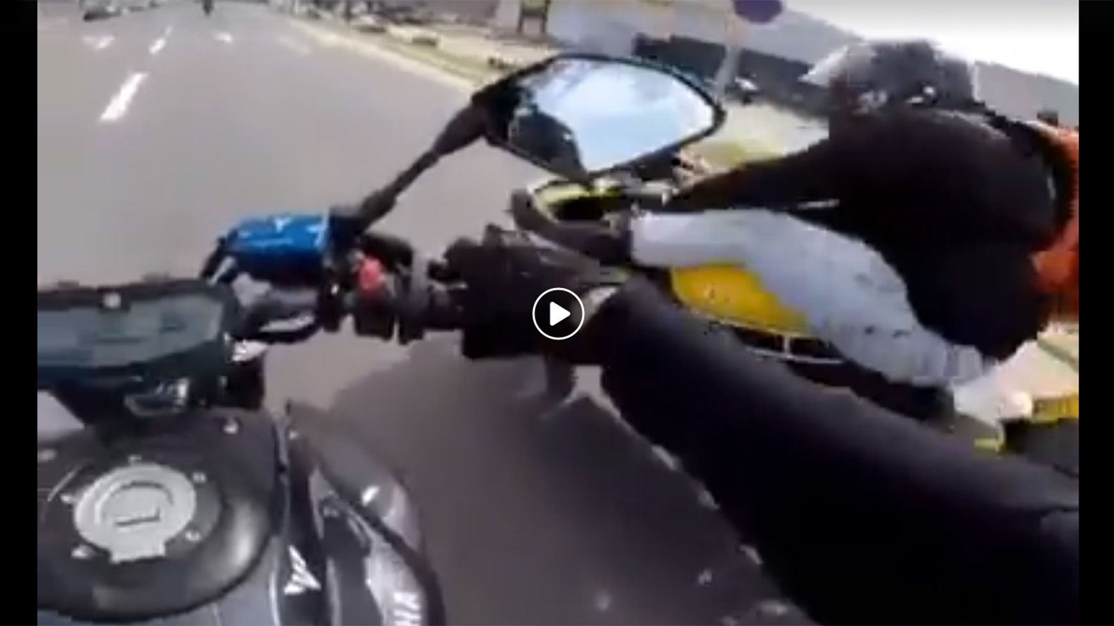 Δυο αναβάτες μάλλον κοντράρονται στο ποιος θα κάνει την μεγαλύτερη… βλακεία στο δρόμο: Ο ένας τελικά πέφτει και ο άλλος προσπαθεί να μαζέψει τα ...